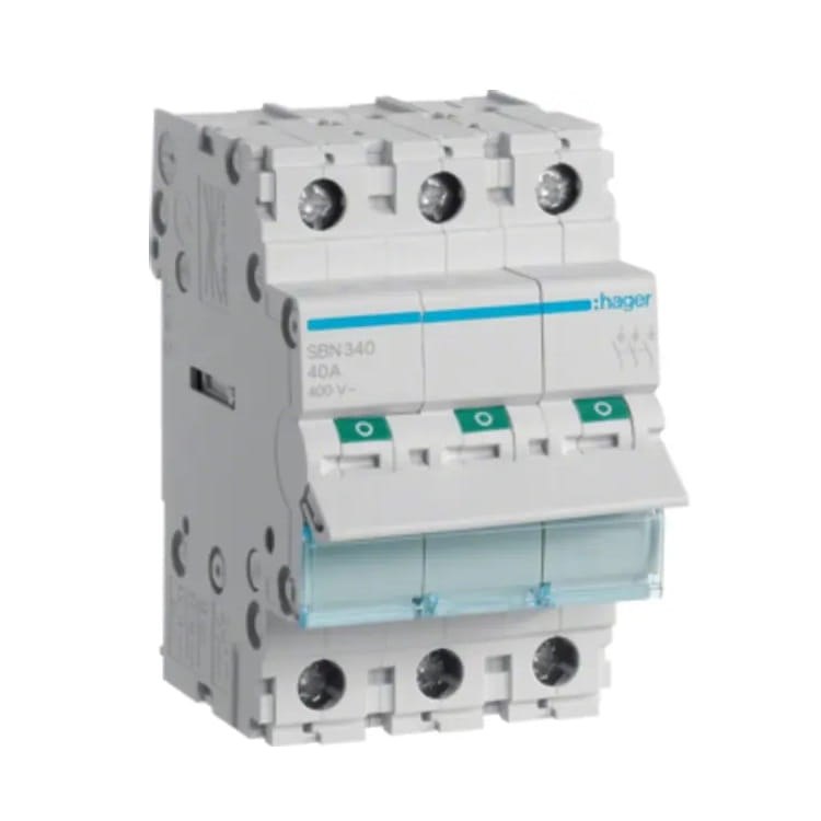 3-Phasen-Lasttrennschalter 3P 40A 400V AC SBN340 HAGER ist eine Art elektrischer Schalter, der mehrere Funktionen erfüllt: Er leitet den Strom unter Nennbedingungen und bei Überlast (einschließlich Kurzschluss für eine bestimmte Zeit), trennt den Stromkreis sowohl unter Nenn- als auch unter Fehlerbedingungen und isoliert, wobei er die Anforderungen an die Isolationseigenschaften für einen sicheren Betrieb des Geräts erfüllt.