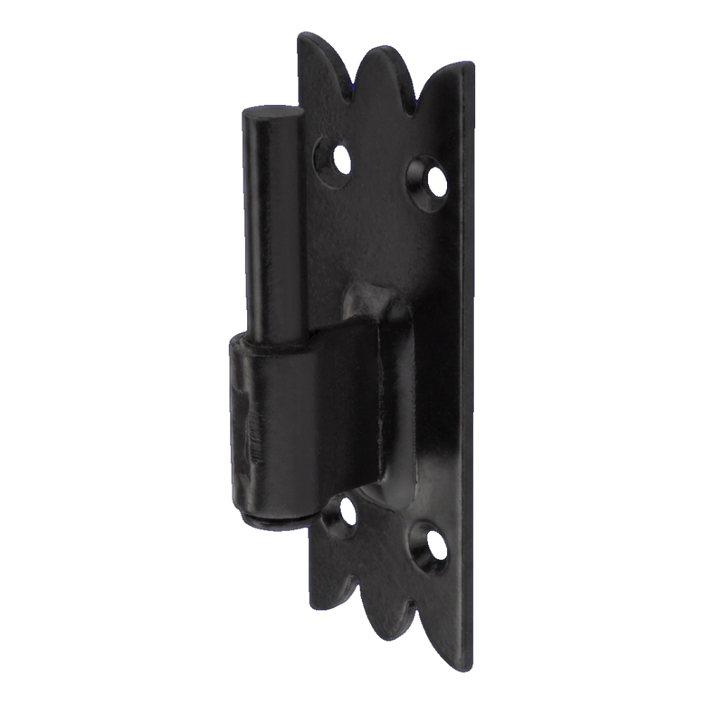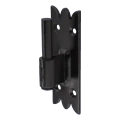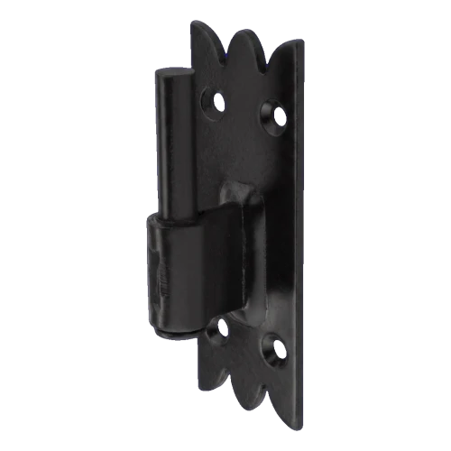 Baulicher Fensterladen-Zierhaken in schwarzer Farbe für bewegliche Verbindung von Fensterläden mit dem Rahmen oder Zarge. Die dekorativ gestaltete Montageplatte mit charakteristischem Muster gezackter Kanten ermöglicht eine ästhetische Integration des Hakens in traditionelle und rustikale Fassaden. Die solide Konstruktion aus galvanisiertem Stahl, geschützt durch Öllack, gewährleistet hohe Korrosions- und mechanische Beständigkeit – auch unter anspruchsvollen Witterungsbedingungen.