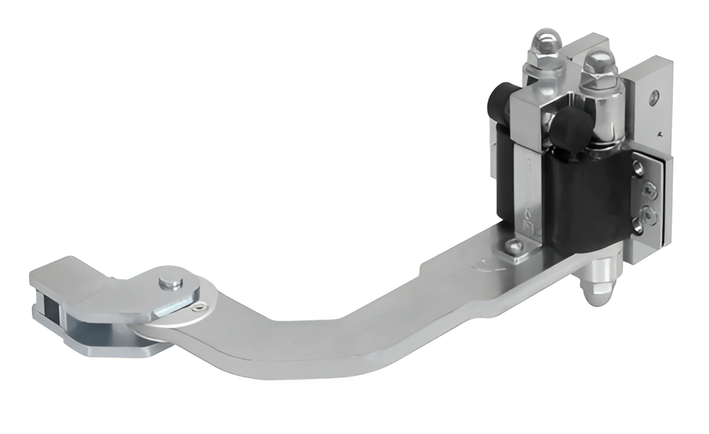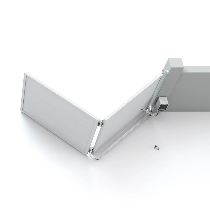 - Unteres Scharnier mit Getriebe und Arm — montiert im unteren Bereich des Torflügels, verantwortlich für den Faltantrieb; der zweiseitig faltbare Übertragungsarm verbindet sich mit der Unterseite des ersten Flügels