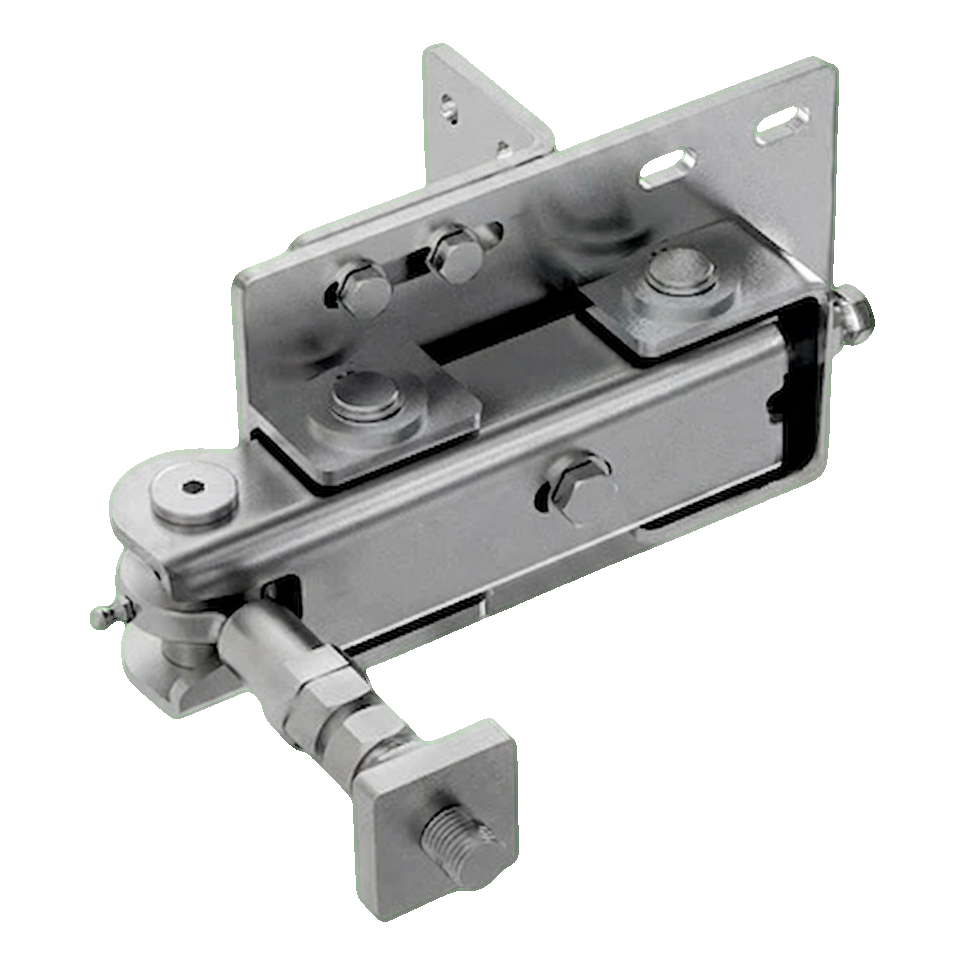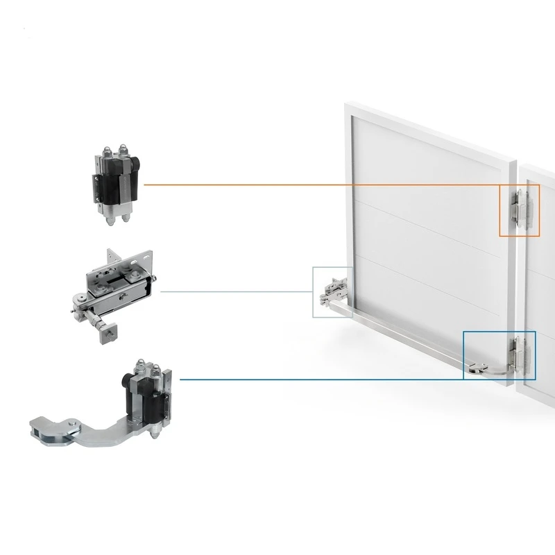 - Oberes Scharnier mit Getriebe — montiert im oberen Bereich des Tors am Pfosten, synchronisiert die Bewegung beider Flügel
