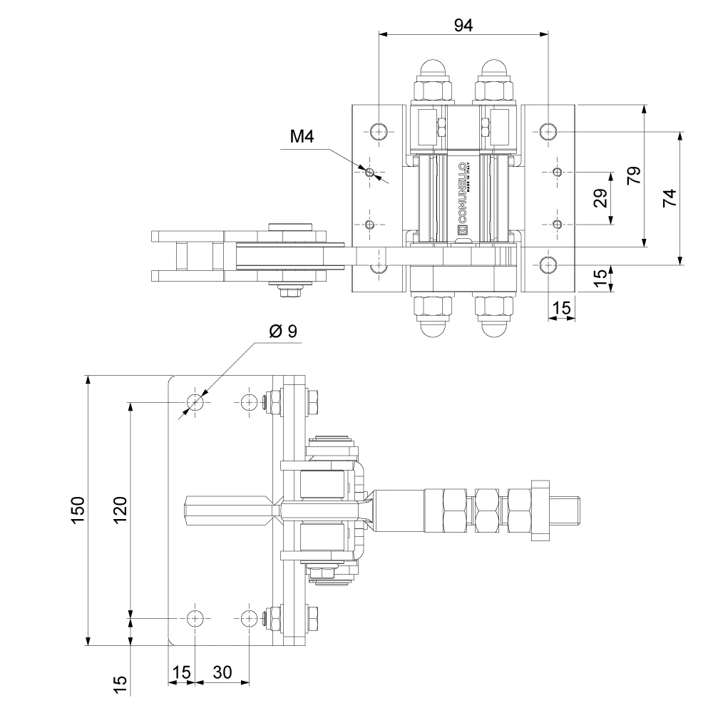 - Verstellbare Halterung — am Pfosten befestigt, ermöglicht präzise Einstellung des gesamten Systems nach der Montage