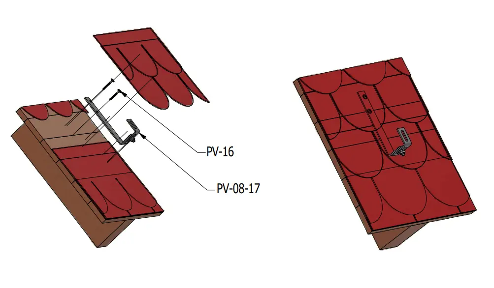 Dachhalterung zur Befestigung von Montageschienen für Photovoltaikmodule an Dachziegeln mit Schiefer- oder Bitumenschindel-Eindeckung. Keine Verstellmöglichkeit - erfordert eine ebene Dachfläche. Bei unebenen Dächern wählen Sie bitte Dachhaken mit einfacher Verstellung.