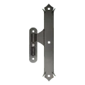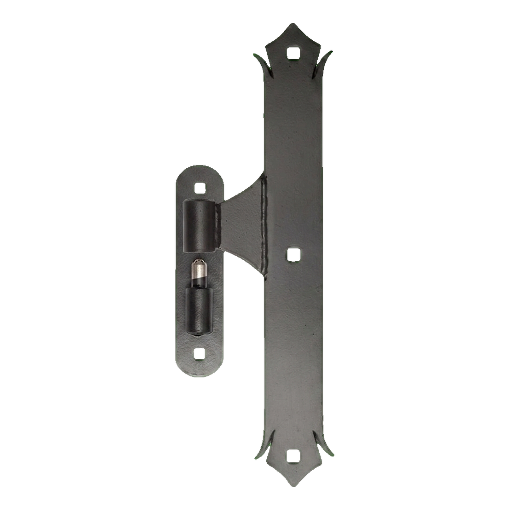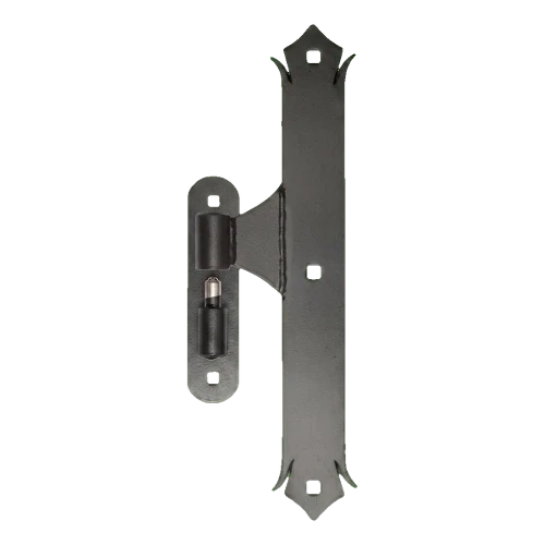 Dekoratives Mittelbandscharnierband mit Kugel bestimmt für die Montage von Flügeltoren. Dekorative Schildenden in Form stilisierter Blätter verleihen dem Tor einen eleganten, geschmiedeten Charakter, und die massive Konstruktion aus 5 mm Flachstahl gewährleistet Langlebigkeit und Zuverlässigkeit für Jahre. Das Scharnier ist mit einer Drehhülse mit Zapfen ausgestattet, was einen reibungslosen Betrieb des Torflügels garantiert.