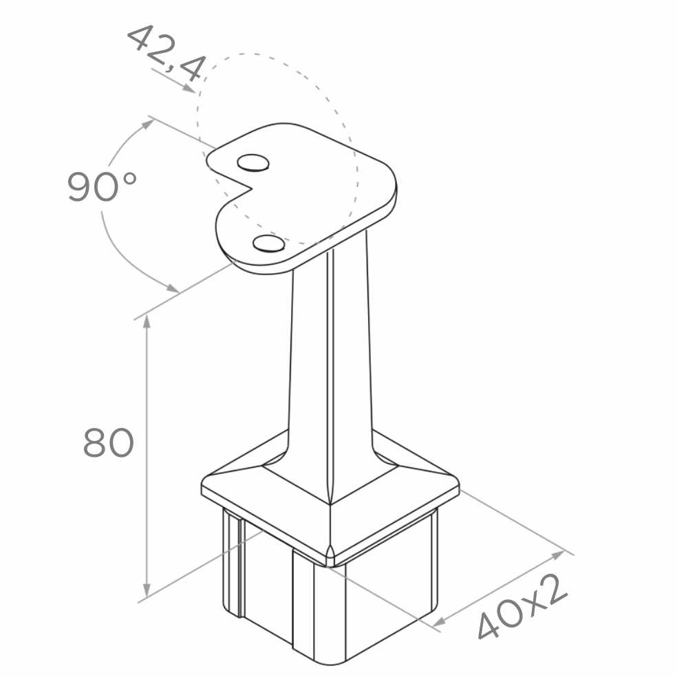 Eckhandlaufträger für Balustradensysteme mit quadratischen Pfosten 40×40 mm. Das Element verbindet den Pfosten mit dem runden Handlauf mit Durchmesser 42,4 mm im 90°-Winkel und schafft eine dauerhafte und ästhetische Eckverbindung. Hergestellt aus hochwertigem Edelstahl AISI 304 in satinierter Oberfläche – korrosionsbeständig und pflegeleicht.