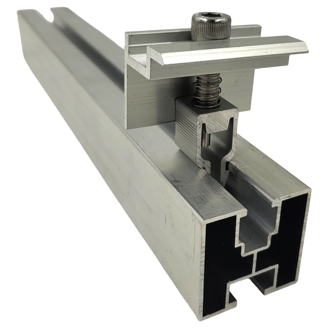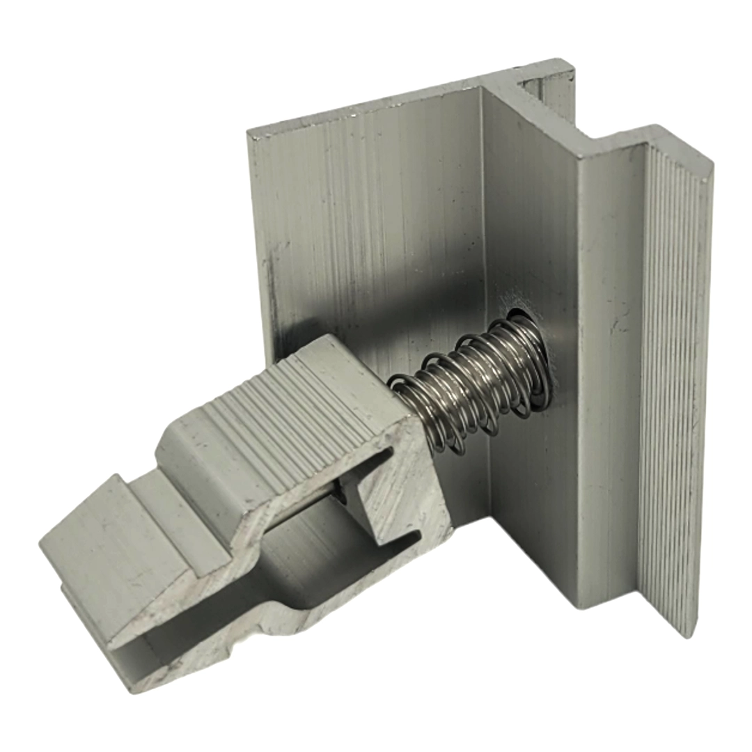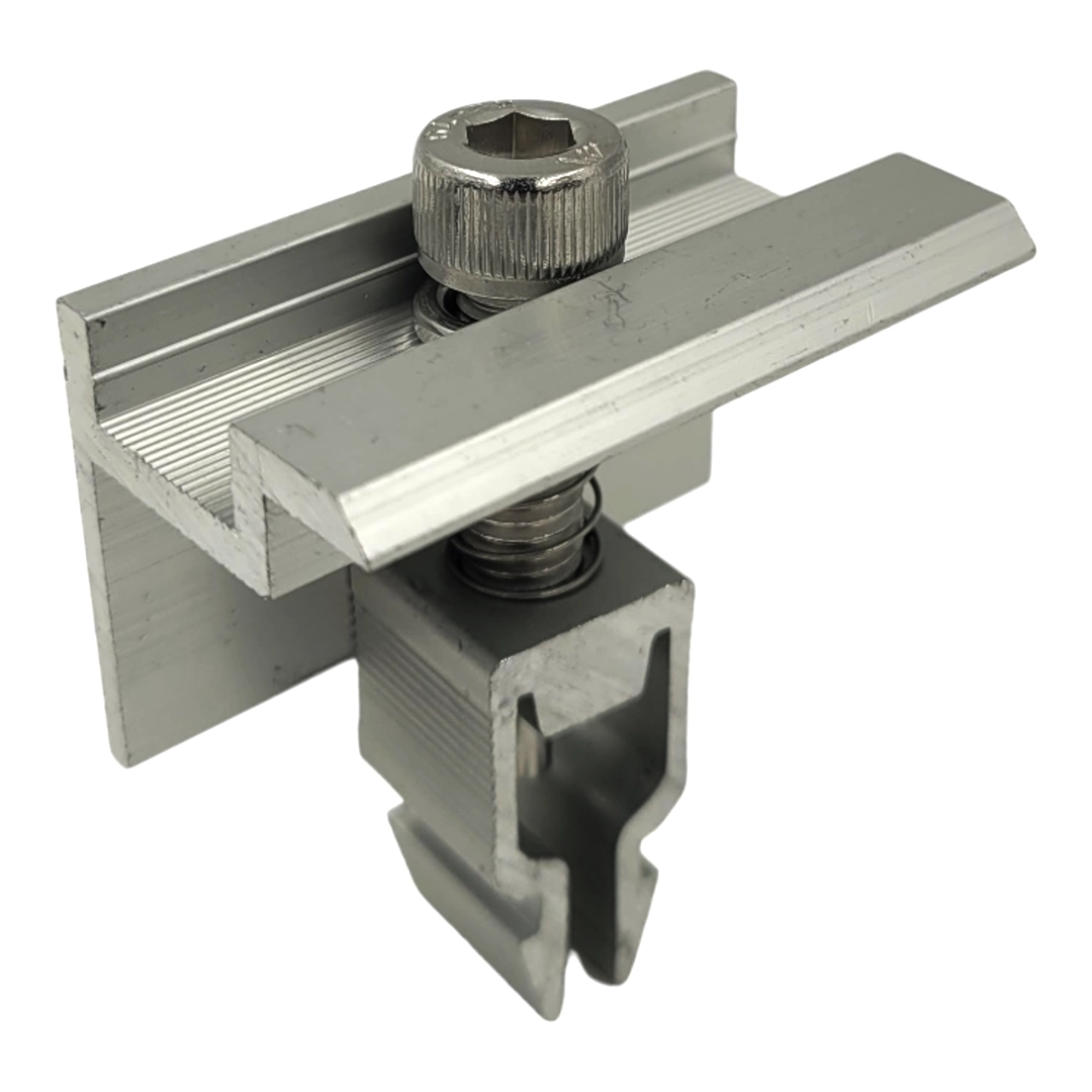 Die Mittelklemme mit Klick und Schraube ist ein integraler Bestandteil der Solarmodulinstallation. Die Mittelklemme ist ein Montageelement für Photovoltaikanlagen und dient zur Befestigung des Photovoltaikmoduls am Aluminium-Strukturprofil. Sie wird für die Montage von Photovoltaikmodulen sowohl auf Flach- als auch auf Schrägdächern verwendet.
