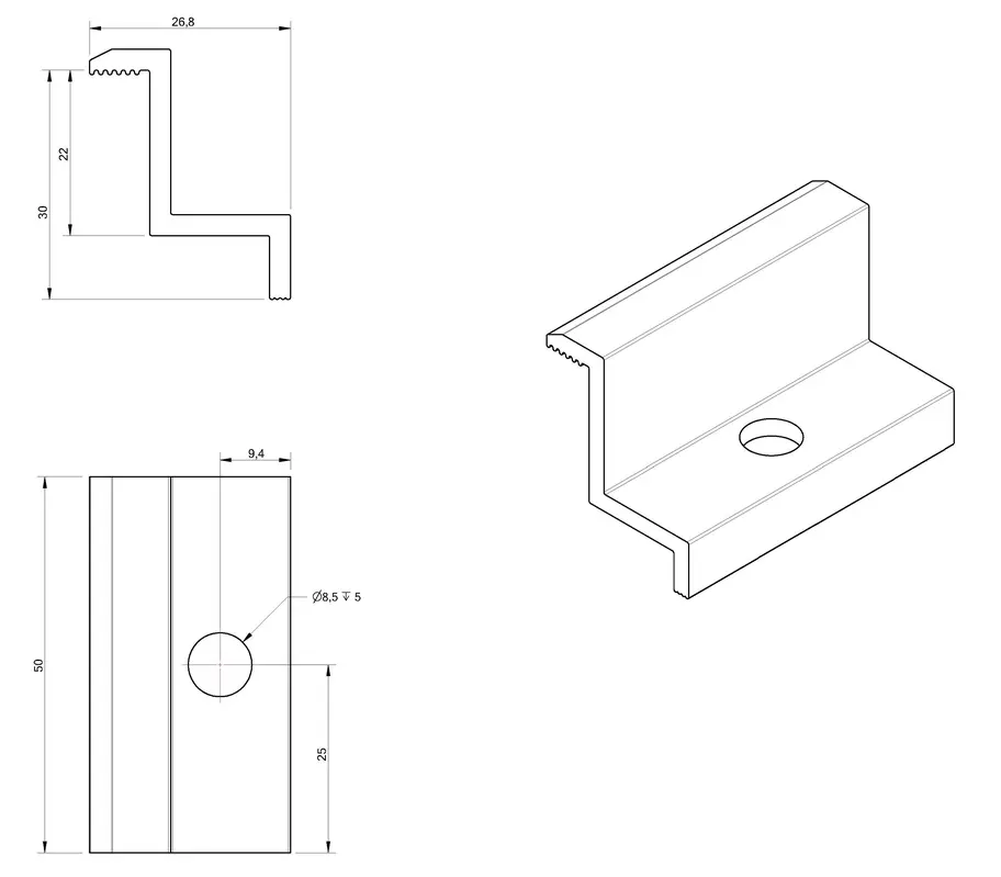 Seitliche Druckklemme aus Aluminium 6060, 30mm, Bohrung M8, für Photovoltaik-Module.