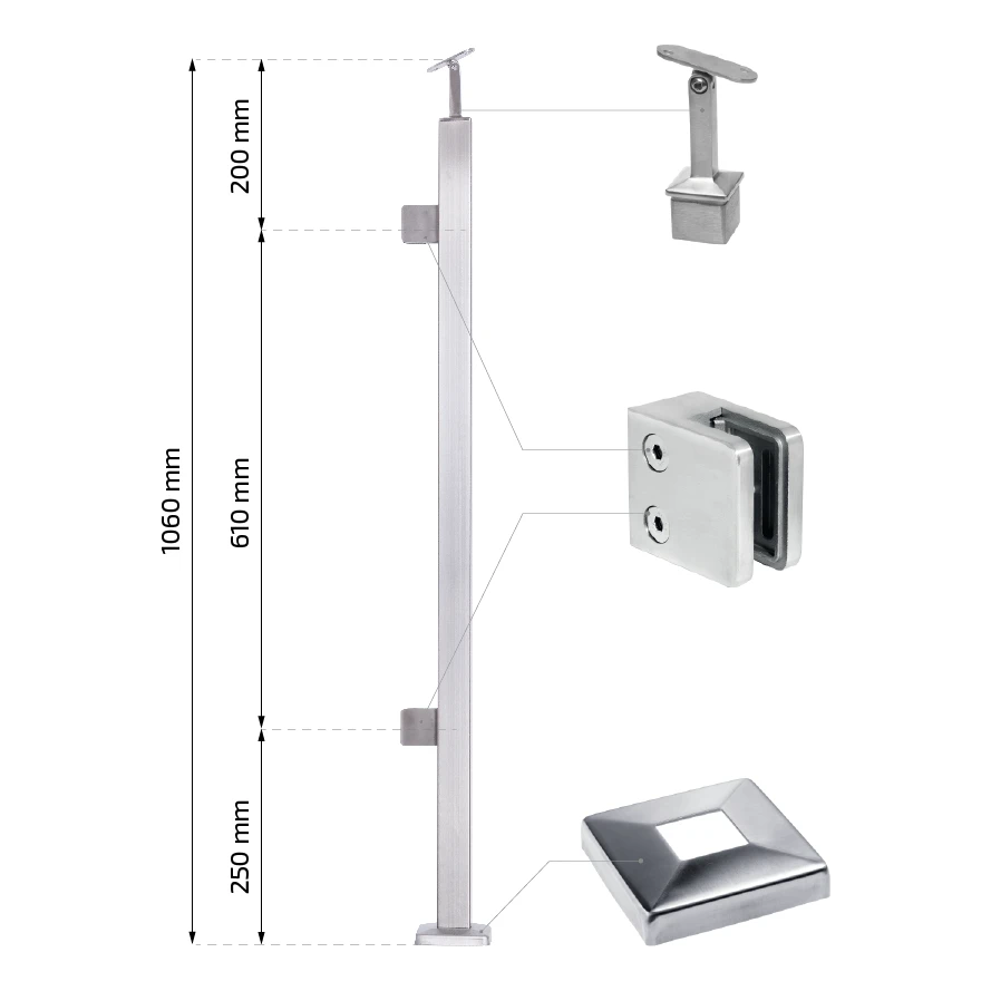 Der Pfosten ist eine universelle Lösung für Geländer mit einer Gesamthöhe einschließlich Handlauf von 1100 mm. Die Handlaufstütze ist nicht dauerhaft verklebt — für ihre Befestigung ist anaerober Kleber für Edelstahl zu verwenden. Diese Lösung bietet volle Flexibilität bei der Montage: die Pfostenstellung kann an die Baustellen-Bedingungen angepasst werden, und bei unebenen Böden kann der Pfosten auf die erforderliche Länge gekürzt werden. Das Set enthält Gummidichtungen für 8 mm Glas — bei Verwendung von Glas anderer Dicke genügt es, die entsprechende Dichtungsgröße zu wählen.