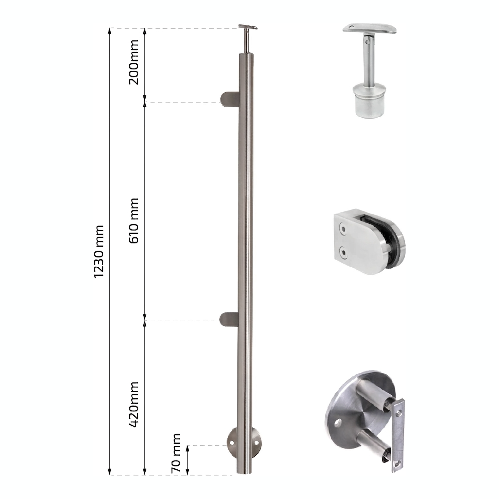 Endpfosten links aus Stahl mit Durchmesser ø42,4 mm und Höhe 1230 mm, bestimmt für den Bau eleganter Glasgeländer. Gefertigt aus hochwertigem rostfreiem Stahl AISI 304 mit satinierter Oberfläche, gewährleistet er Langlebigkeit und ästhetisches Aussehen sowohl innen als auch außen an Gebäuden. Der Pfosten ist mit zwei Glashaltern und seitlicher Befestigung an der Wand ausgestattet, was eine schnelle und stabile Montage ohne die Notwendigkeit einer Bodenverankerung ermöglicht.