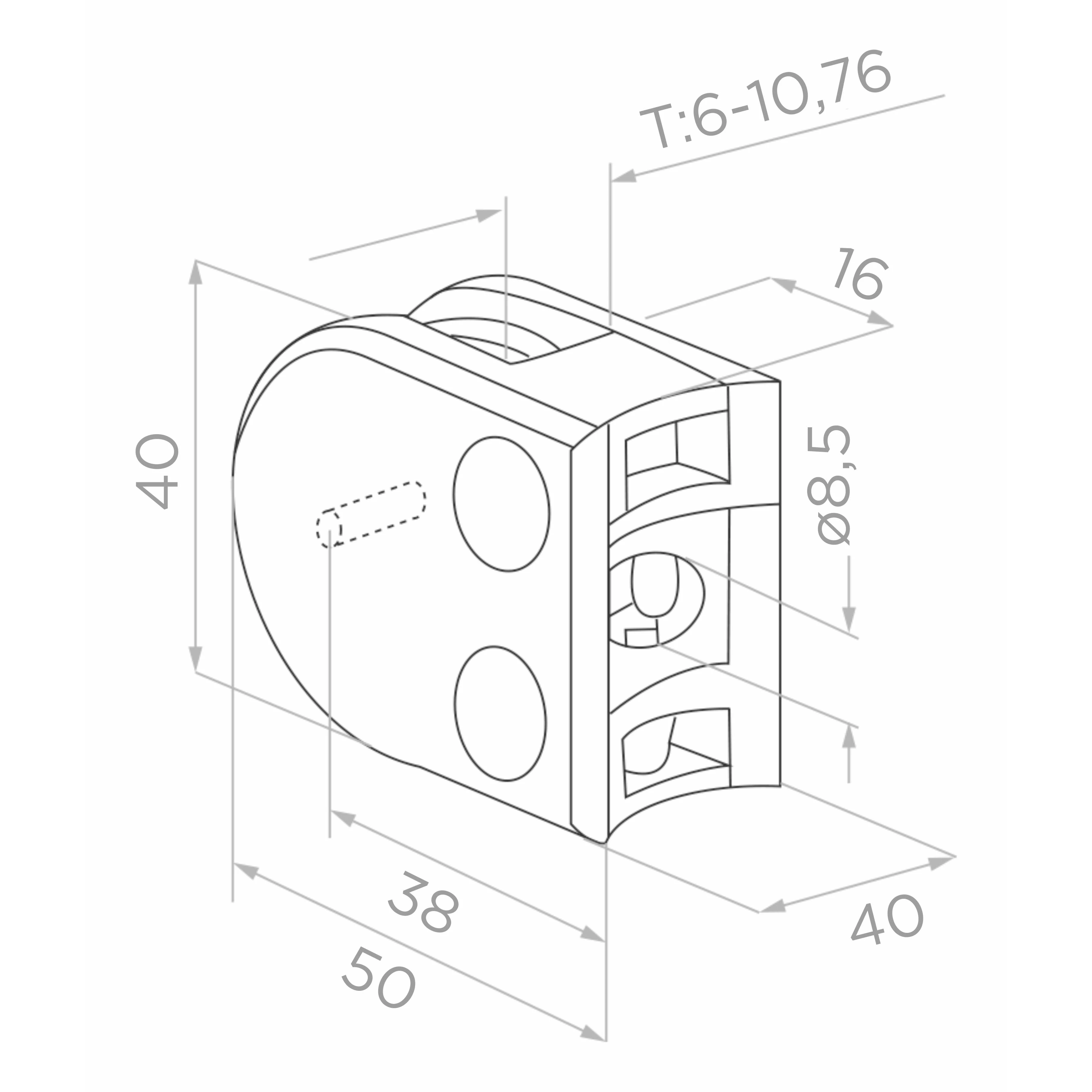 - Glashalter — 2 Stück, Abmessungen 50 × 40 × 40 mm, Befestigungsbohrung ø 8,5 mm