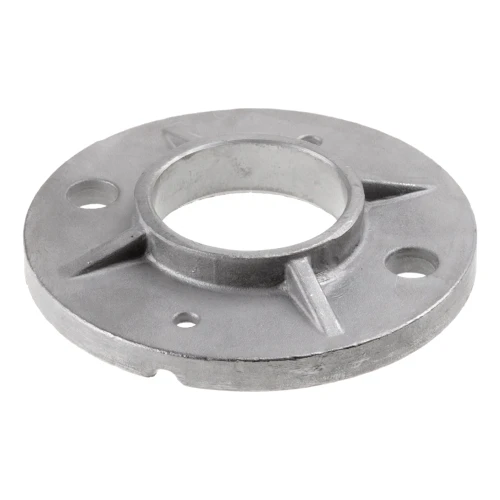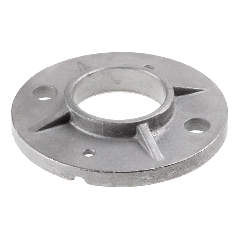 Das Element ist bereit zum Schweißen oder Einpressen des Geländerrohrs in den zentralen Flansch. Die radial angeordneten Verstärkungsrippen erhöhen die Tragfähigkeit der Verbindung und verhindern ein Lockern des Pfostens unter Seitenbelastung.
