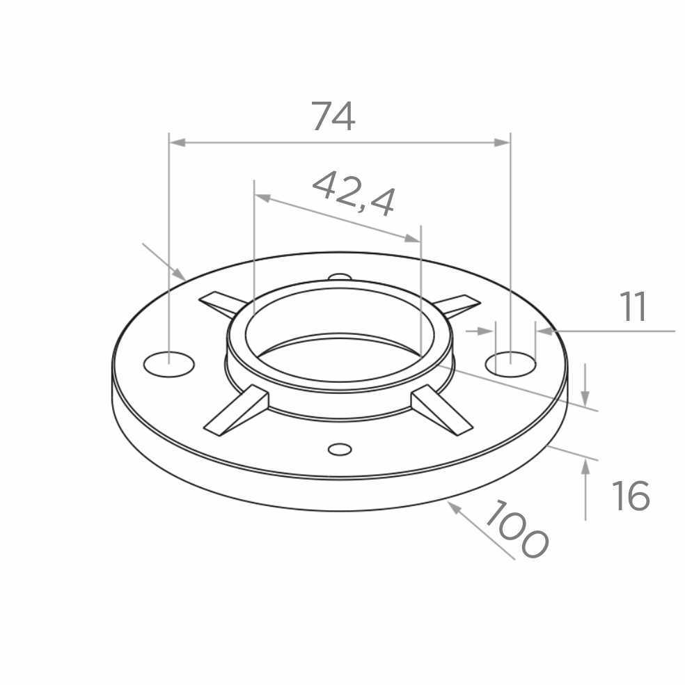 Der Flanschfuß findet überall dort Anwendung, wo eine stabile Befestigung eines senkrechten Geländerpfostens auf einer ebenen Fläche erforderlich ist. Er bewährt sich sowohl bei Innengeländern (Treppenhäuser, Zwischengeschosse, Galerien) als auch bei Außengeländern (Terrassen, Balkone). Der Innendurchmesser 42,4 mm entspricht dem Standard-Geländerrohr ⌀42,4 mm (1¼"), was volle Kompatibilität mit den am Markt verfügbaren gängigsten Geländersystemen garantiert.