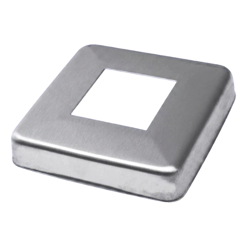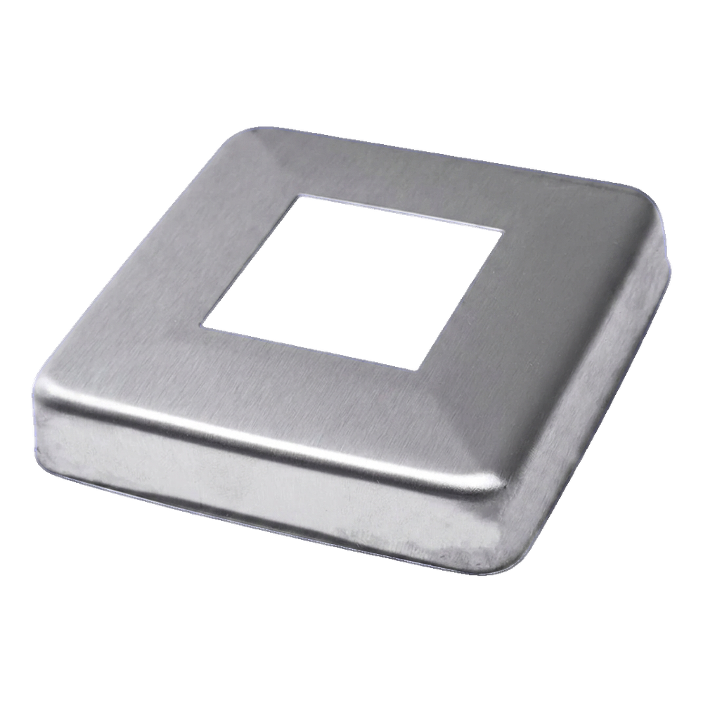 Abdeckrosette für quadratisches Profil 40×40 mm — ästhetisches Abschlusselement zum Verdecken von Montagelöchern bei Edelstahlgeländern. Dank der polierten Oberfläche aus Stahl AISI 304 verleiht sie der Konstruktion ein professionelles, einheitliches Aussehen und schützt die Durchgangsstelle des Pfosten durch die Grundplatte oder den Boden.