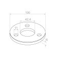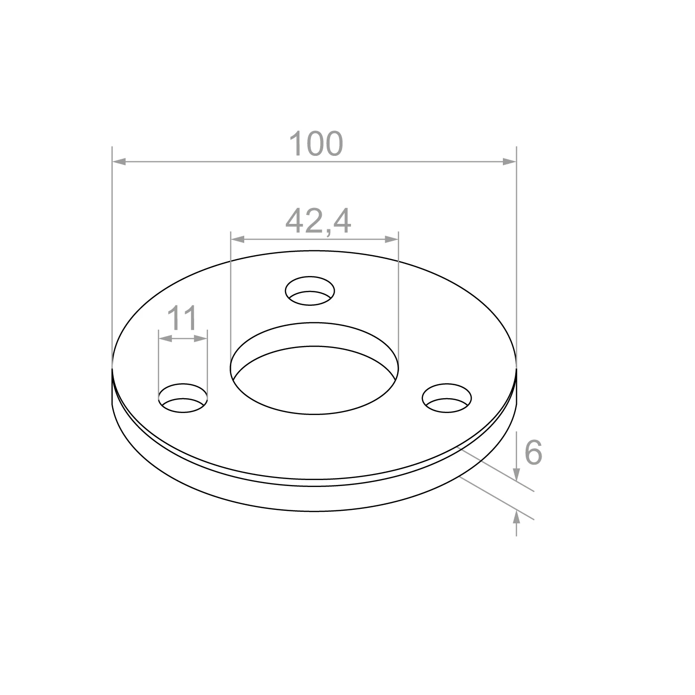 Die Basis verfügt über drei Montagelöcher mit einem Durchmesser von 11 mm, die gleichmäßig am Umfang verteilt sind und eine sichere und symmetrische Befestigung ermöglichen. Die zentrale Bohrung mit einem Durchmesser von 42,4 mm ist an die Pfosten des Systems 42,4 mm angepasst — der Pfosten wird direkt in die Bohrung eingeschweißt und erhält so eine dauerhafte und steife Verbindung.