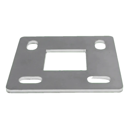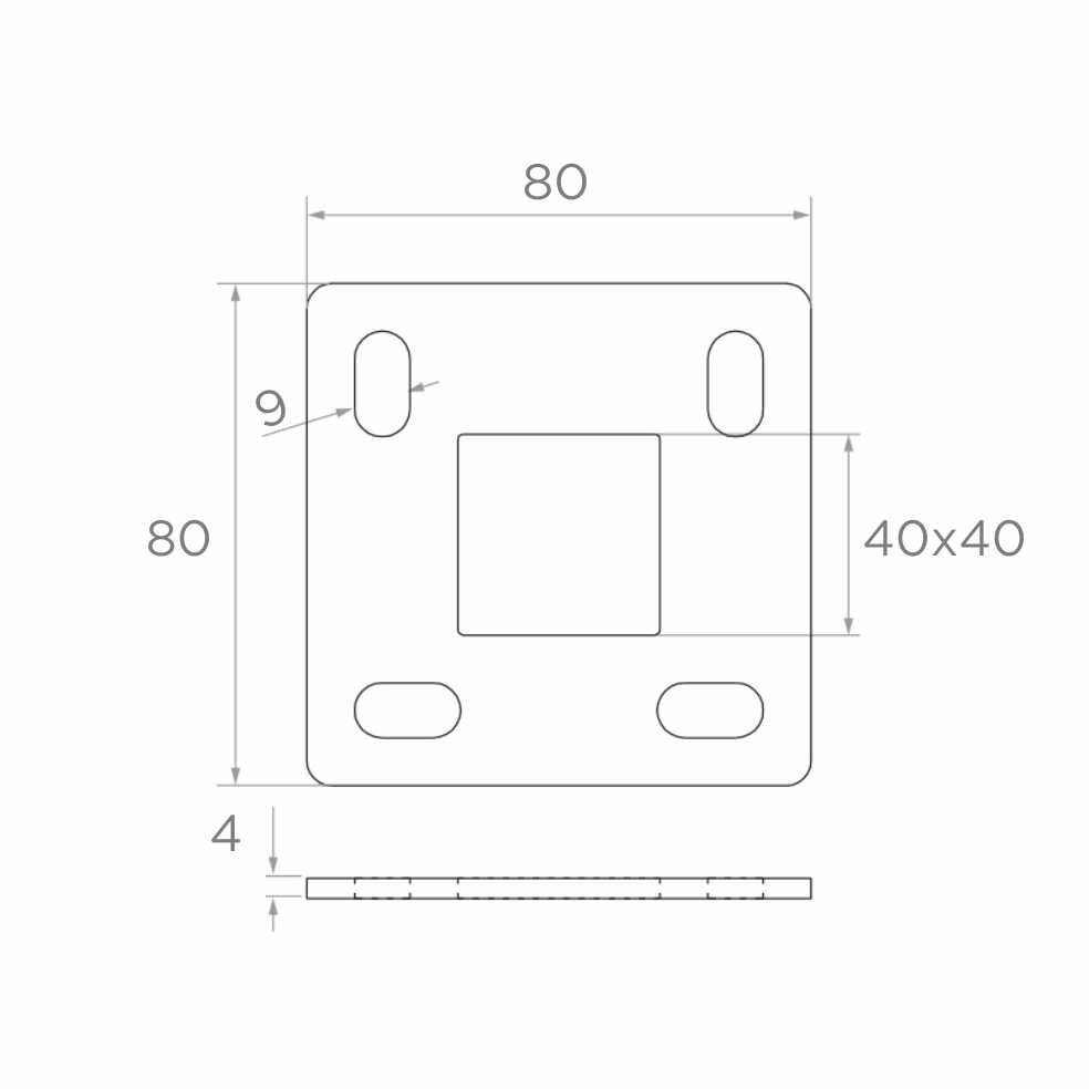 Vier ovale Befestigungslöcher (9×20 mm) bieten Flexibilität beim Verankern am Untergrund – die Positionsregulierung der Schrauben erleichtert die präzise Ausrichtung des Pfostens auch auf unebenen Oberflächen. Das zentrale Loch 40×40 mm ist auf das Standard-Quadratprofilsystem abgestimmt und garantiert Kompatibilität mit gängigen Geländerpfosten.