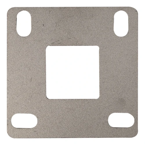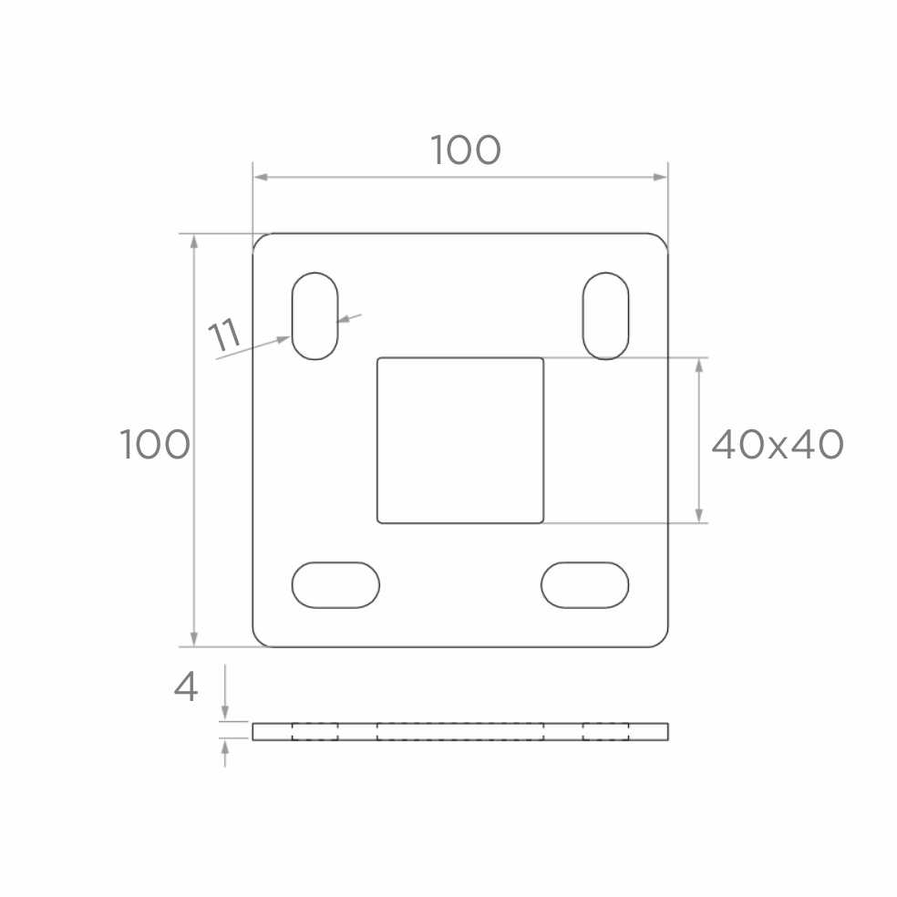 Die Basis verfügt über ein zentrales quadratisches Loch 40x40 mm, das an das Pfostenprofil angepasst ist, sowie vier Montagelöcher vom Typ Langloch (11x20 mm), die eine präzise Positionsregulierung beim Anschrauben an den Untergrund ermöglichen. Die rohe Oberfläche (ohne zusätzliche Bearbeitung) erlaubt das Schweißen ohne Entfernung von Beschichtungen — sofort nach dem Auspacken einsatzbereit.