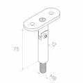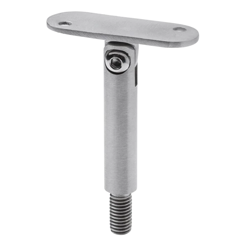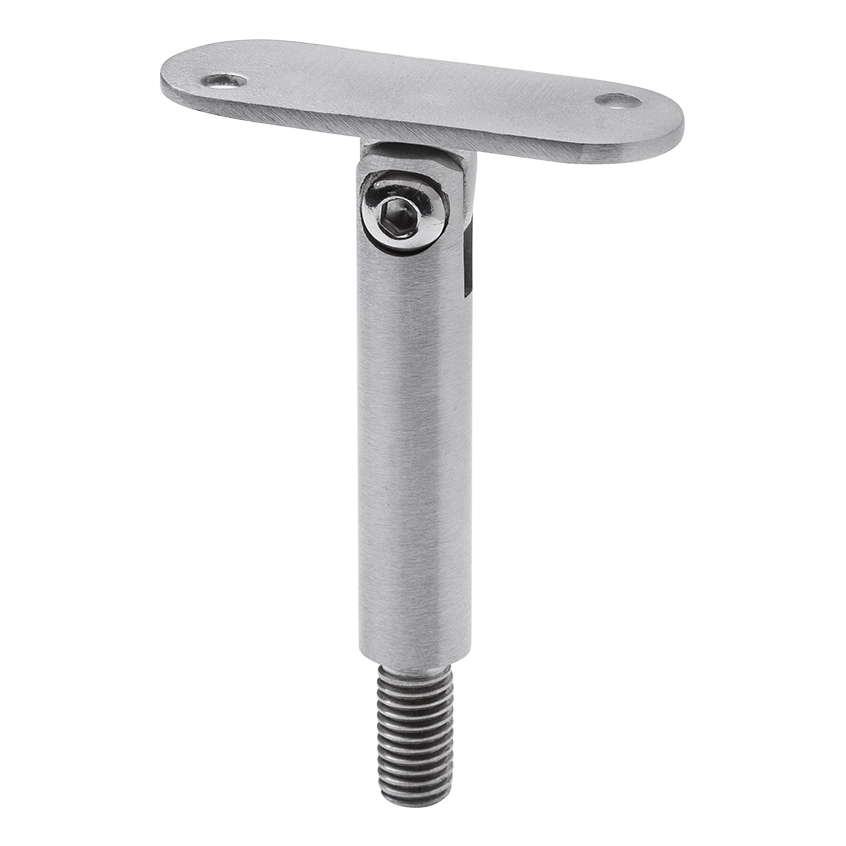 Gelenkige Handlaufstütze mit flacher Montageplatte, bestimmt für Edelstahl-Balustraden im Flachsystem. Der Gelenkstab ermöglicht die Verstellung des Handlauf-Neigungswinkels, was besonders nützlich bei der Montage von Treppenbalustraden ist — erlaubt die präzise Einstellung der Handlauf-Neigung passend zum Treppenlauf.