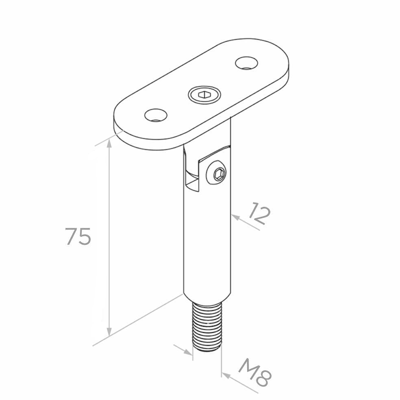 Der untere Teil des Stabes ist mit einem Außengewinde M8 versehen, was das direkte Einschrauben der Stütze in den Balustradenpfosten ermöglicht. Die obere flache Montageplatte mit zwei Löchern dient zur Anschraubung des Handlaufs. Das Gelenk zwischen Zapfen und Platte gewährleistet vollständige Freiheit bei der Winkelverstellung, wodurch ein Stützentyp sowohl gerade als auch geneigte Abschnitte bedient.