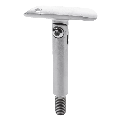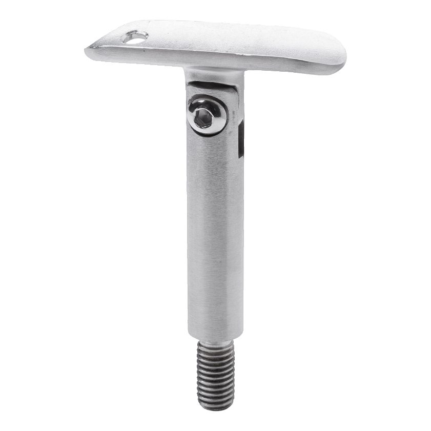 Element für professionelle Edelstahl-Geländersysteme basierend auf Rohr fi 42,4 mm. Ideal für Treppengeländer, wo eine Einstellung des Handlaufneigungswinkels erforderlich ist. Das Gelenk gewährleistet Einstellungsfreiheit, und das Gewinde M8 ermöglicht eine schnelle Montage durch Einschrauben in eine vorbereitete Bohrung im Pfosten. Die satinierte Oberflächenbehandlung des Edelstahls AISI 304 garantiert Korrosionsbeständigkeit sowie ein ästhetisches, mattes Erscheinungsbild — kohärent mit den übrigen Elementen des Geländersystems.