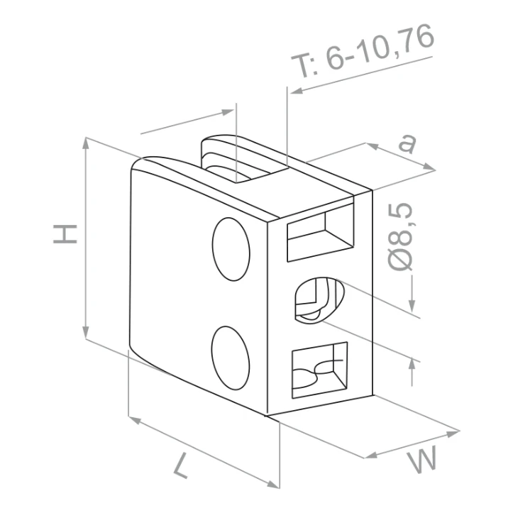 Rechteckiger Glashalter aus Edelstahl AISI 316 in Satin-Finish, konzipiert für die Montage auf flachen Oberflächen. Die kompakte Konstruktion mit den Abmessungen 45 × 45 × 26 mm ermöglicht eine sichere Befestigung von Glasscheiben mit einer Dicke von 6 bis 10,76 mm – sowohl für Einscheibensicherheitsglas als auch für Verbundglas.