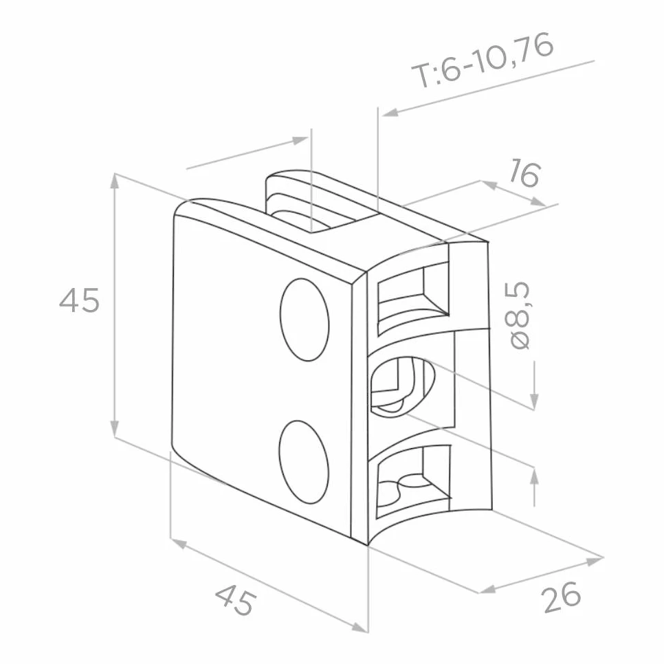 Rechteckiger Glashalter zur Befestigung von Glasscheiben mit einer Dicke von 6 bis 10,76 mm an Rohrstützen mit einem Durchmesser von 42,4 mm. Gefertigt aus Edelstahl AISI 304 mit satinierter Oberfläche — ein ästhetisches und langlebiges Element für Glasgeländer und Glastrennwände.