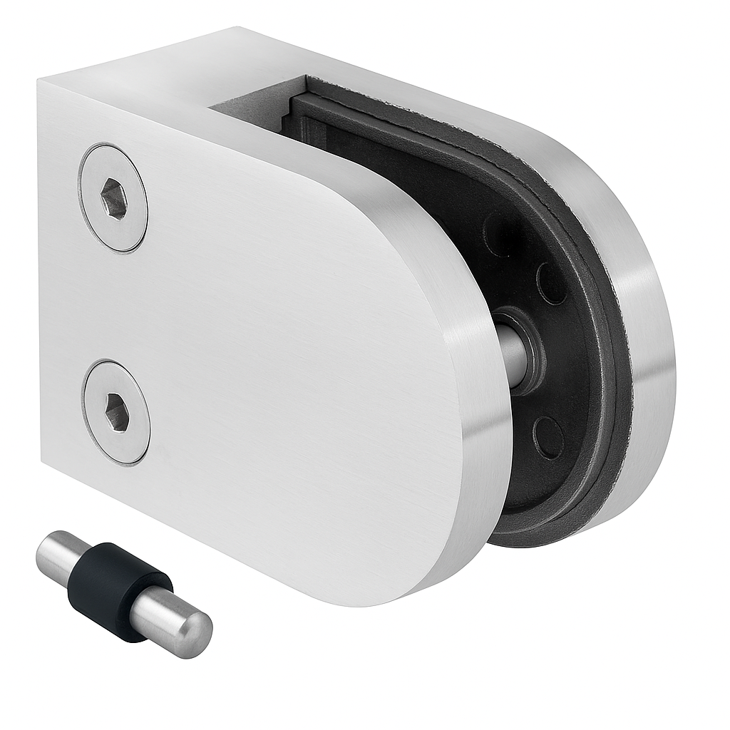 Im Lieferumfang ist ein Sicherungspin enthalten, der ein unbeabsichtigtes Herausrutschen der Glasscheibe aus dem Halter verhindert – dies erhöht die Sicherheit der Installation und macht die Suche nach zusätzlichen Elementen überflüssig. Eine Gummieinsatz im Inneren des Halters schützt die Glaskante vor Beschädigungen und gewährleistet einen stabilen, spielfreien Halt der Scheibe.