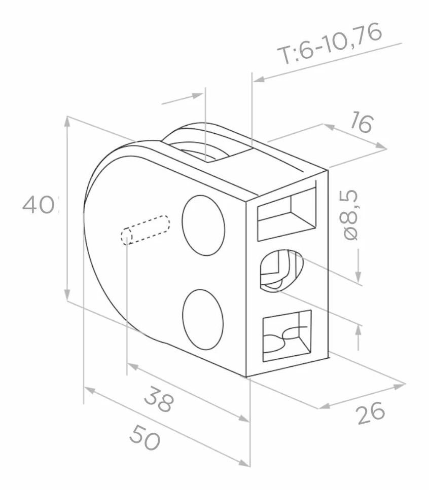 Glashalter 50×40×26 mm aus Edelstahl AISI 316 in Satin-Finish — eine zuverlässige Lösung für die Montage von Glasscheiben auf ebenen Flächen. Das Produkt ist für den professionellen Einsatz in Glasgeländern, Verkleidungen und Glastrennwänden konzipiert, wo hohe Korrosionsbeständigkeit sowie eine ästhetische, moderne Optik gefordert sind.