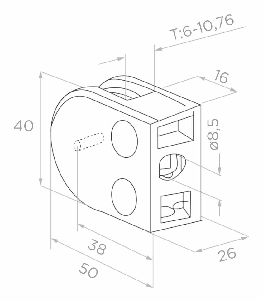 Der Halter wird komplett mit Sicherungspin geliefert. Distanzgummis, die für die ordnungsgemäße Einbettung des Glases im Halter erforderlich sind, müssen separat erworben werden. Dank des universellen Glasstärkenbereichs von 6–10,76 mm eignet sich der Halter sowohl für die Montage von Einscheibenglas als auch für Verbundsicherheitsglas (z. B. VSG). Die rohe Oberflächenausführung ermöglicht eine beliebige Pulverlackierung und bietet damit volle Freiheit bei der Farbwahl für das jeweilige Projekt – von der Terrassenbrüstung bis zur Innenverglasung im Büro.