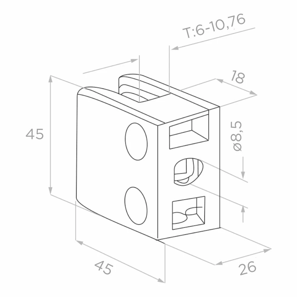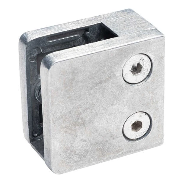 Rechteckiger Glashalter 45×45×26 mm mit Konsole und Sicherungspin — konzipiert für die Montage von Glasscheiben mit einer Stärke von 6 bis 10,76 mm in systemischen Glasgeländern. Die kompakte Konstruktion aus rohem Zamak gewährleistet eine zuverlässige Stabilisierung der Glasscheibe auf ebenen Flächen, während Innensechskantschrauben eine präzise Anpassung des Anpressdrucks ohne Demontage des Halters ermöglichen.