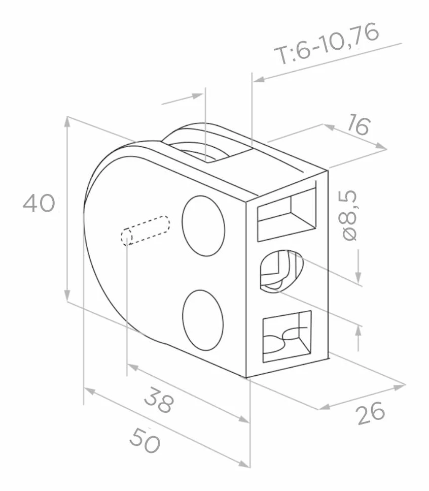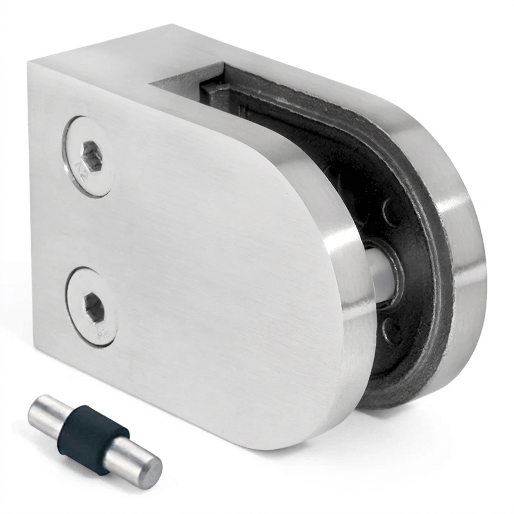 Der Halterkorpus ist aus Edelstahl AISI 304 gefertigt — einer korrosionsbeständigen Güte, die den Einsatz sowohl im Innen- als auch im Außenbereich ermöglicht. Die polierte Oberfläche (Spiegelglanz) verleiht dem Halter ein elegantes Erscheinungsbild, das perfekt mit modernen Glasgestaltungen harmoniert. Eine innenliegende Gummidichtung sorgt für sicheren Halt des Glases ohne Kratzerrisiko. Zwei Inbusschrauben ermöglichen eine präzise Anpassung des Anpressdrucks — ohne vollständige Demontage des Halters, was Montagearbeiten und eventuelle Korrekturen auf der Baustelle erheblich beschleunigt.