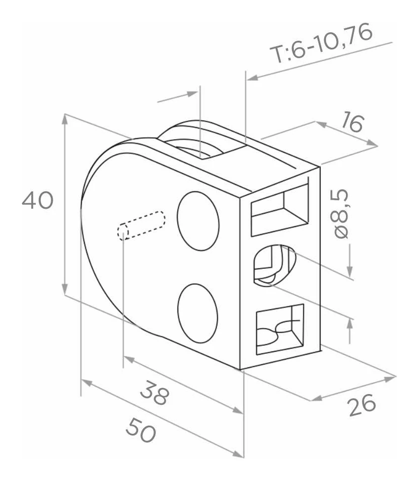 Der Halter wird durch Einschrauben in eine ebene Fläche über die Montagebohrung mit einem Durchmesser von Ø 8,5 mm befestigt. Zwei Inbusschrauben an der Vorderseite des Halters ermöglichen die Einstellung des Glasandrucks – sie können angezogen oder gelockert werden, ohne den Halter von der Konstruktion zu demontieren. Diese Lösung beschleunigt die Montagearbeiten erheblich und erleichtert die Wartung von Glasgeländern.