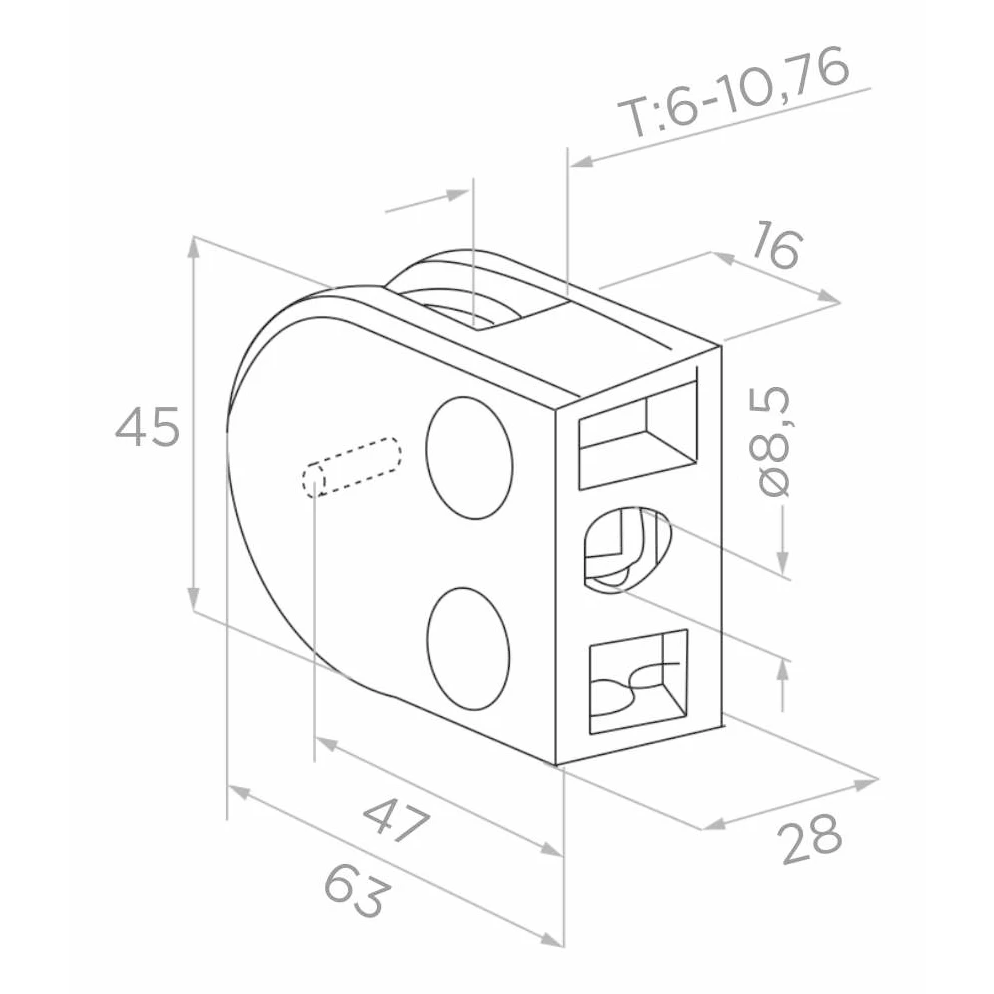 Abgerundeter Glashalter mit den Abmessungen 63×45×28 mm, geeignet für die Montage von Glasscheiben mit einer Dicke von 6 bis 10,76 mm auf ebenen Flächen. Gefertigt aus nichtrostendem Stahl AISI 304 mit Satin-Finish — die ideale Wahl für elegante Glasgeländer, Innenverkleidungen und Trennwandsysteme in gewerblichen und Wohngebäuden.