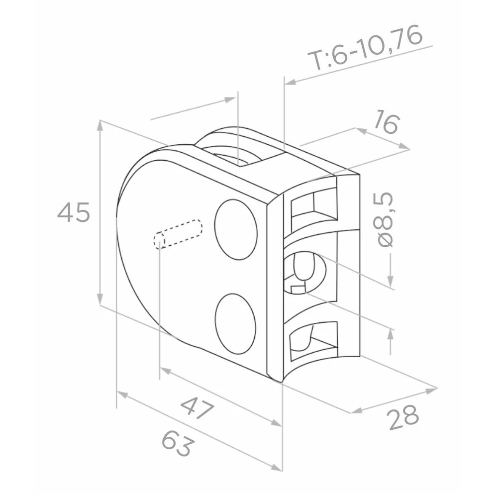 Abgerundeter Glashalter für systemische Glasgeländer auf Basis eines Rohres Ø 42,4 mm. Er dient zur stabilen Befestigung von Glasscheiben mit einer Dicke von 6 bis 10,76 mm und gewährleistet sowohl die Sicherheit der Konstruktion als auch ein ästhetisches Erscheinungsbild. Im Lieferumfang ist ein Sicherungspin enthalten, der die Scheibe vor dem unbeabsichtigten Herausgleiten aus dem Halter schützt.