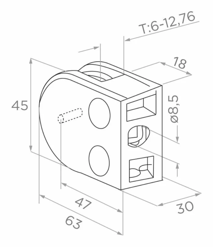 Glashalter mit Montagekonsole und Sicherungspin für Glasgeländersysteme. Dient zur stabilen Befestigung von Glasscheiben mit einer Dicke von 6 bis 12,76 mm. Die abgerundete Form des Halters verleiht der Konstruktion eine ansprechende Optik, während die solide Ausführung aus Edelstahl AISI 304 mit Satinoberfläche Langlebigkeit und Korrosionsbeständigkeit gewährleistet.
