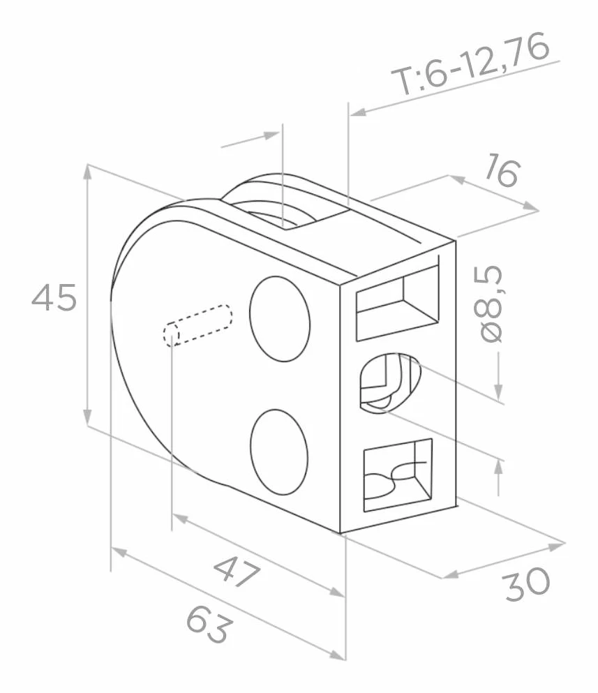Abgerundeter Glashalter für systemische Glasgeländer und Ganzglasgeländer. Dient zur stabilen Befestigung von Glasscheiben mit einer Dicke von 6 bis 12,76 mm und sichert diese durch den mitgelieferten Sicherungspin gegen Herausrutschen. Gefertigt aus Edelstahl AISI 304 mit satinierter Oberfläche – korrosionsbeständig und gleichermaßen für den Innen- und Außenbereich geeignet.