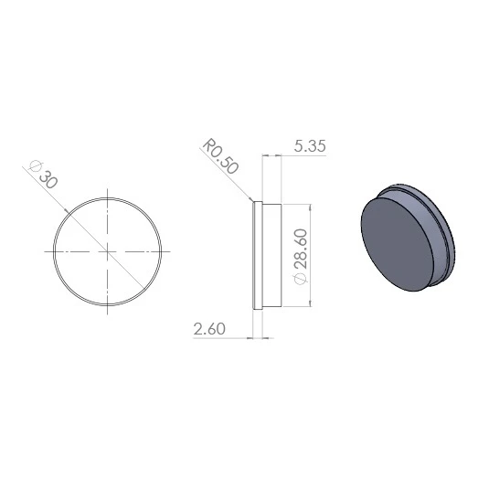Die Endkappe dient zur Abdeckung von Montagelöchern, die nach der Installation der Geländerprofile zurückbleiben. Die Unterseite des Elements ist mit konzentrischen Rillen ausgestattet, die eine sichere Befestigung im Profilloch gewährleisten. Das Element wird direkt in das Loch eingedrückt – es erfordert kein Kleben oder mechanische Befestigung, was die Abschlussarbeiten auf der Baustelle erheblich beschleunigt.