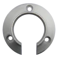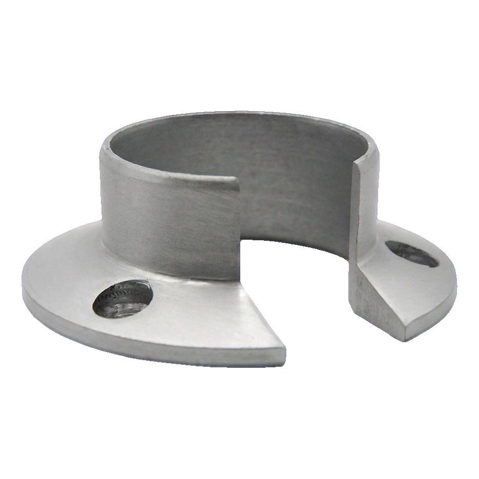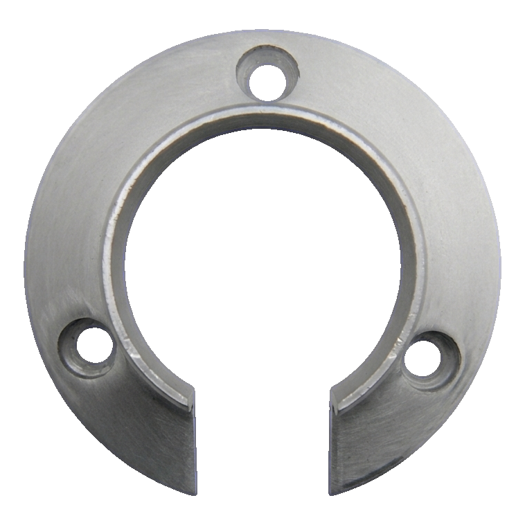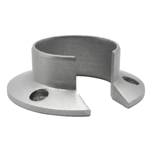 Das Element besitzt einen charakteristischen U-förmigen Ausschnitt mit einer Breite von 20 mm, der ein seitliches Aufschieben auf den Handlauf ohne Demontage des gesamten Systems ermöglicht. Der Montageflansch mit einem Durchmesser von 82 mm gewährleistet eine große Auflagefläche am Untergrund. Drei symmetrisch am Flanschumfang angeordnete Löcher garantieren eine gleichmäßige Verteilung der Befestigungskräfte. Die Senkungen für Schraubköpfe (ø 10 mm) ermöglichen ein bündiges Versenken des Schraubkopfs im Flansch, was eine glatte und ästhetische Montagefläche gewährleistet.