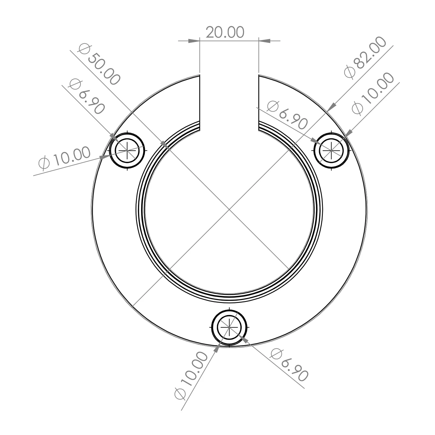 - Montagelöcher: 3 Stk. mit Durchmesser 6,9 mm und Senkungen ø 10 mm