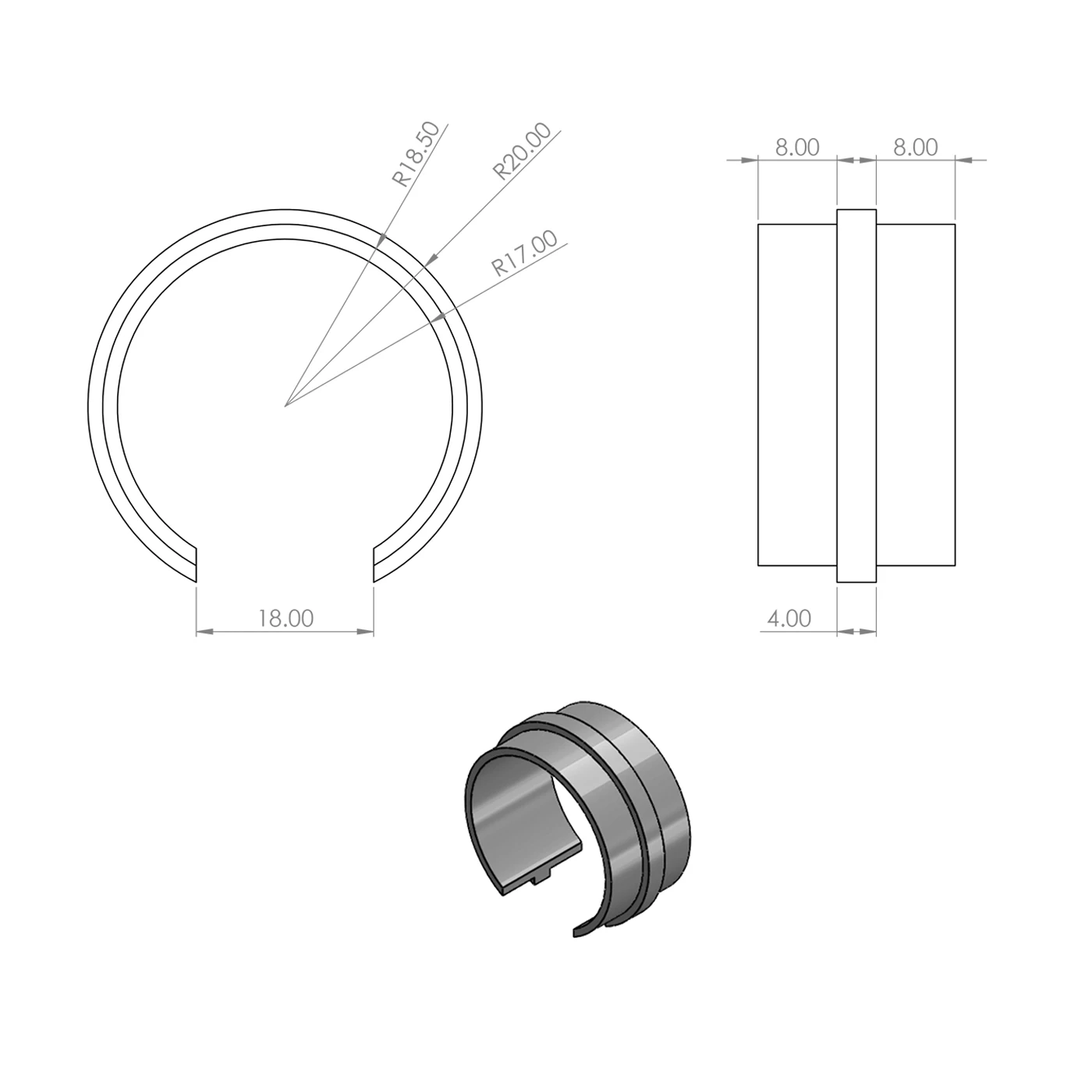 Der Unterschied zwischen den Radien R18,50 und R17,00 erzeugt eine Abstufung, die für eine stabile Befestigung des Handlaufs sorgt – das Element passt präzise ohne Spiel. Der zentrale Bund mit Radius R20,00 mm und Dicke 4 mm fungiert als Anschlag und hält den Verbinder in konstanter Position an der Scheibenkante. Symmetrische Einschubsegmente von je 8 mm auf jeder Seite gewährleisten eine gleichmäßige Abstützung des Handlaufs und ein professionelles Erscheinungsbild der fertigen Balustrade.