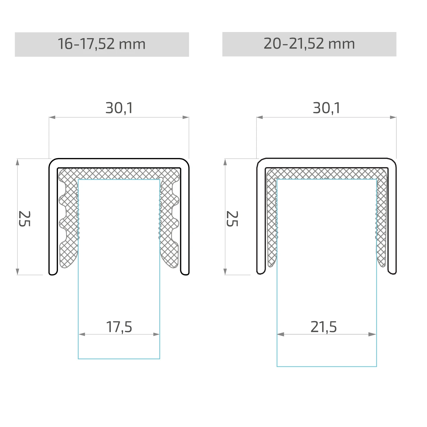 Der Handlauf arbeitet mit zwei Typen austauschbarer Dichtungen zusammen, was die Montage auf Scheiben verschiedener Dicken ermöglicht. Für Glas 16–17,52 mm wird eine Dichtung verwendet, die den Montagespalt auf 17,5 mm anpasst, während für Glas 20–21,52 mm — eine Dichtung, die ihn auf 21,5 mm erweitert. Diese Flexibilität eliminiert die Notwendigkeit, separate Profile für verschiedene Projekte zu bestellen.