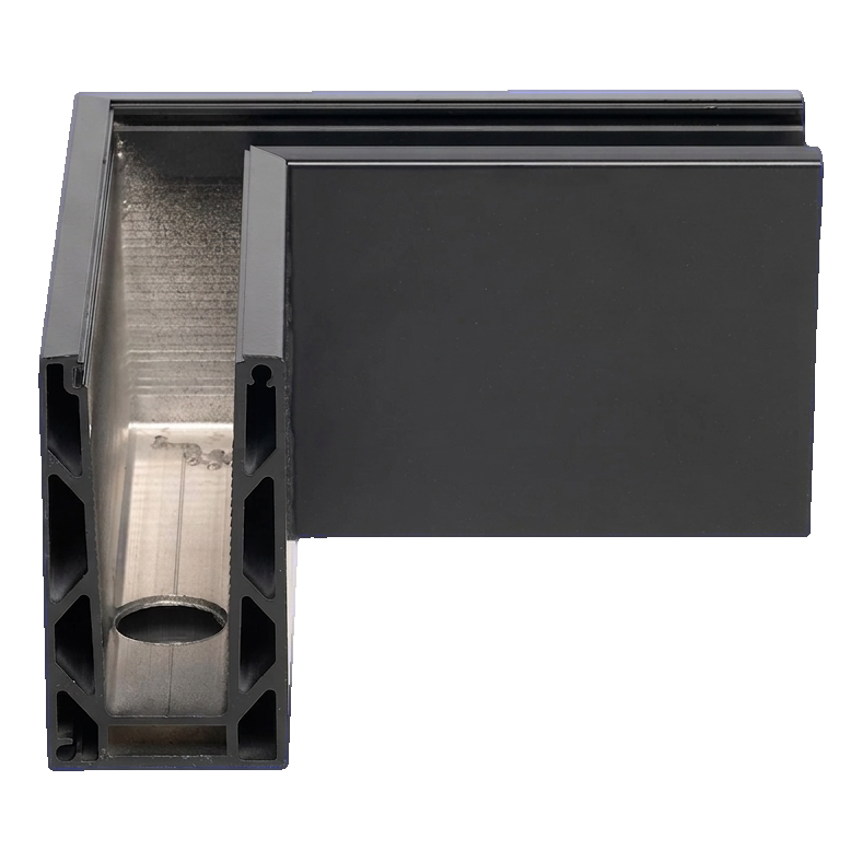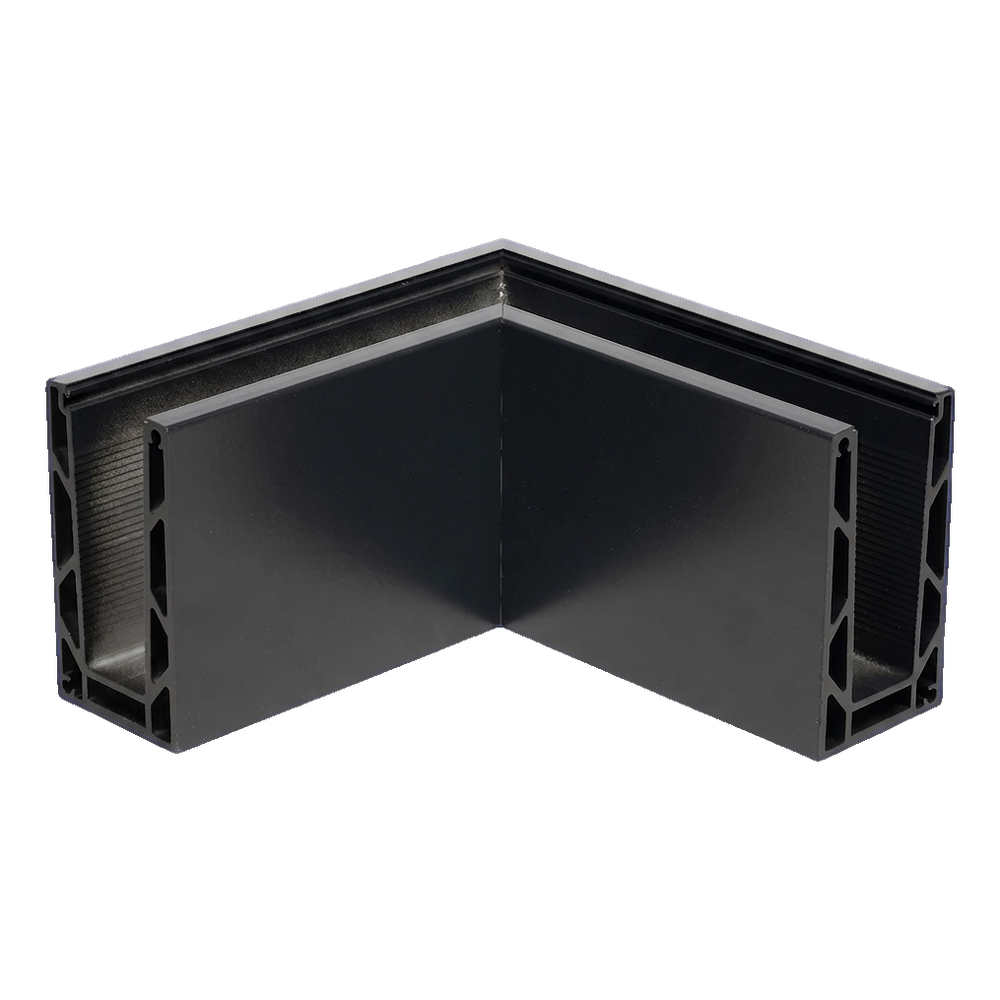 Das Eckprofil U-Typ KE 100 der Marke Kozza ist ein Element zur Ausbildung von Außenecken mit 90° bei Vollglas-Geländern mit Montage von oben. Die symmetrischen Schenkel mit einer Länge von 197 mm gewährleisten eine präzise Verbindung zweier Glasscheiben im rechten Winkel – ohne Versätze und Fugen, unter Beibehaltung einer einheitlichen Profil- und Scheibenlinie in einer Ebene.