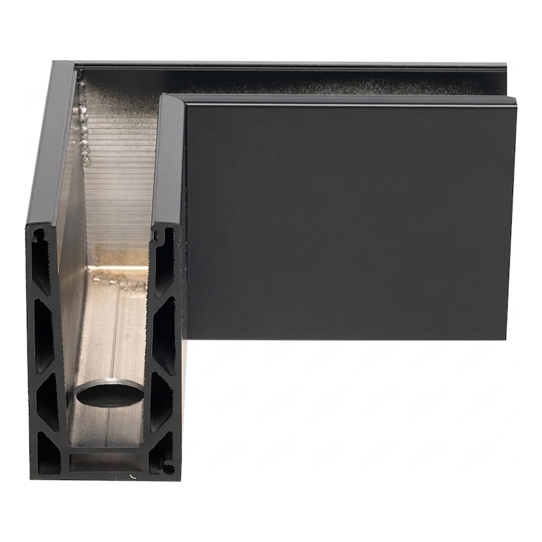 Das Profil ist aus Aluminium in dunkelgrauer Farbe gefertigt, was harmonisch zu modernen Böden, anthrazitfarbenen Fensterprofilen und gebürstetem Edelstahl passt. Das Element ist für Innenanwendungen konzipiert — bewährt sich in Korridoren, Lobbys, Einkaufszentren und Bürogebäuden, wo klare Glaslinien ohne aufwendige Pfosten gefragt sind.