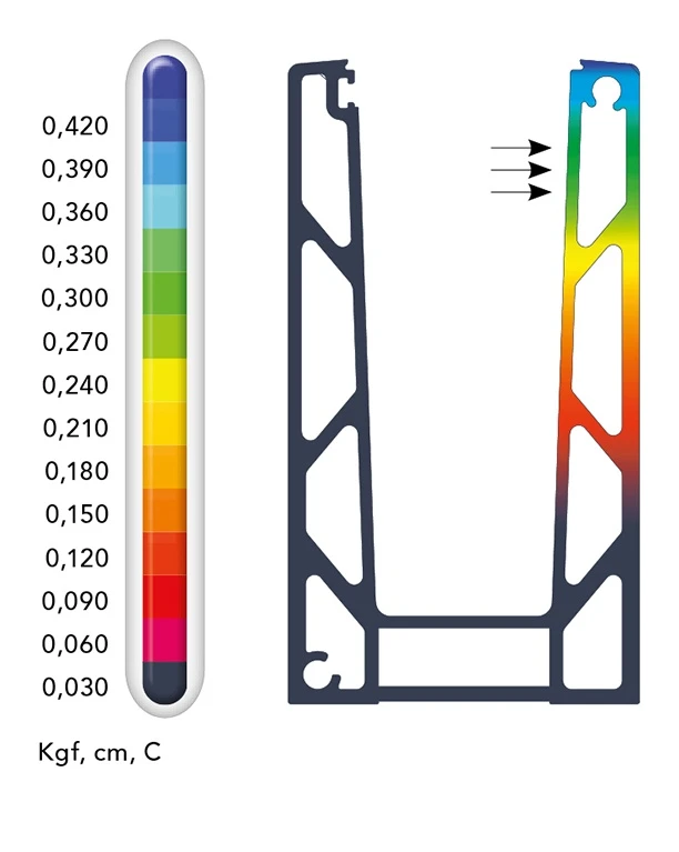 Das Profil mit einer Basislänge von 1 m bei horizontaler Belastung bis zu 500 kg (5000 N·t) behält hohe Steifigkeit und minimale Verschiebungen bei. Die Finite-Elemente-Methode (FEM) bestätigt, dass die maximalen Verschiebungswerte unter Windbelastung im Bereich von 0,030 bis 0,420 Kgf/cm liegen — die größten Verformungen treten im oberen Teil des Profils auf (an der Klemmkante), während die Basis praktisch unbeweglich bleibt.
