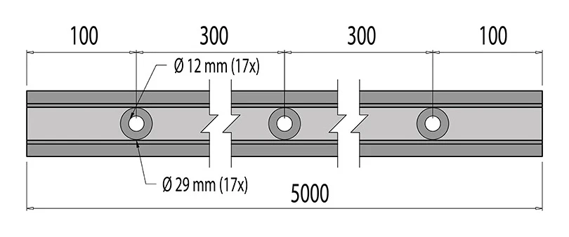 Das Profil verfügt über 17 Befestigungsbohrungen, die gleichmäßig über die gesamte Länge von 5000 mm verteilt sind. Die Durchgangsbohrungen haben einen Durchmesser von Ø 12 mm mit Senkungen Ø 29 mm. Der Achsabstand der Bohrungen beträgt 300 mm, und die Entfernung von der Profilkante zur Achse der ersten und letzten Bohrung beträgt 100 mm.