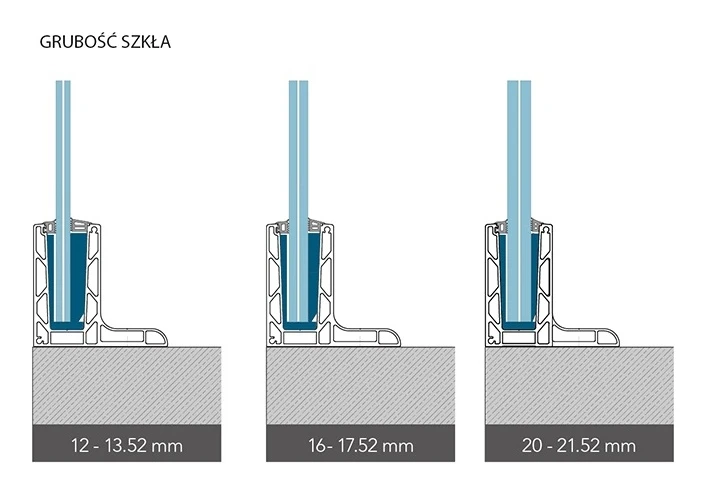 - Universeller Glasdickenbereich – das Profil nimmt Scheiben von 12 bis 21,52 mm Dicke auf, was die Notwendigkeit der Lagerung verschiedener Profilvarianten eliminiert