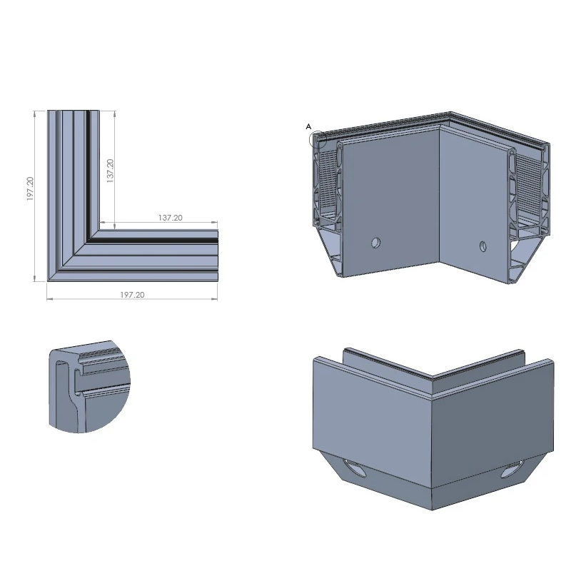 Das Außeneckprofil KE 120 ist für Ganzglasgeländersysteme konzipiert, bei denen Glasscheiben direkt im U-Profil ohne zusätzliche Punkthalter eingesetzt werden. Durch die seitliche Befestigung wird das Element an der seitlichen Oberfläche der tragenden Konstruktion montiert, was eine saubere Geländerlinie von der Außenseite ermöglicht. Die symmetrischen Arme mit einer Länge von 197 mm gewährleisten eine stabile Glasunterstützung auf beiden Seiten der Ecke. Das Profil arbeitet mit den anderen Elementen der KE 120 Serie von Kozza zusammen — geraden Profilen, Innenecken und Zubehör — und bildet ein stimmiges, komplettes Geländersystem.