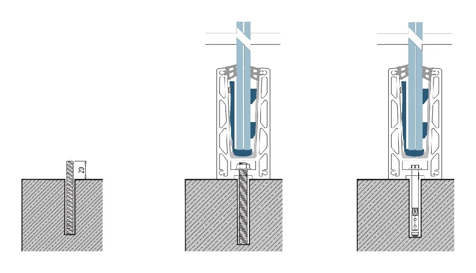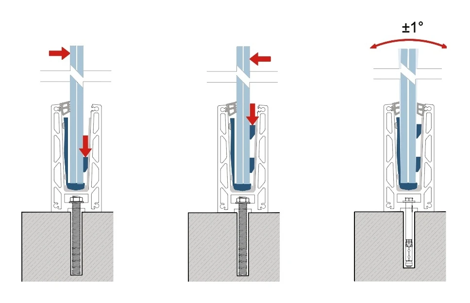 Das Profil wird von oben montiert, was den Zugang während der Installation erleichtert und es ermöglicht, Befestigungselemente unter der Bodenverkleidung oder Decke zu verbergen. Das System ermöglicht die Justierung der Glasstellung in horizontaler Richtung sowie die Neigungskorrektur im Bereich ±1°, sodass der Installateur die Scheibe auch auf unebener Unterlage präzise ausrichten kann. Die Verankerungstiefe beträgt min. 20 mm.