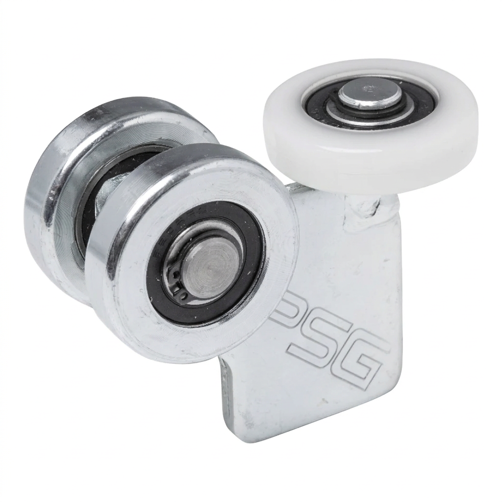 3-Rollen-Laufwagen für Hängeschiebtore — präzise gefertigtes Laufelement, konstruiert für die Zusammenarbeit mit dem Führungsprofil 60×60 mm. Die Konstruktion basiert auf zwei stählernen Tragrollen sowie einer Führungsrolle aus Kunststoff und gewährleistet einen reibungslosen und leisen Betrieb des Einfahrtstores – auch bei intensiver Nutzung.