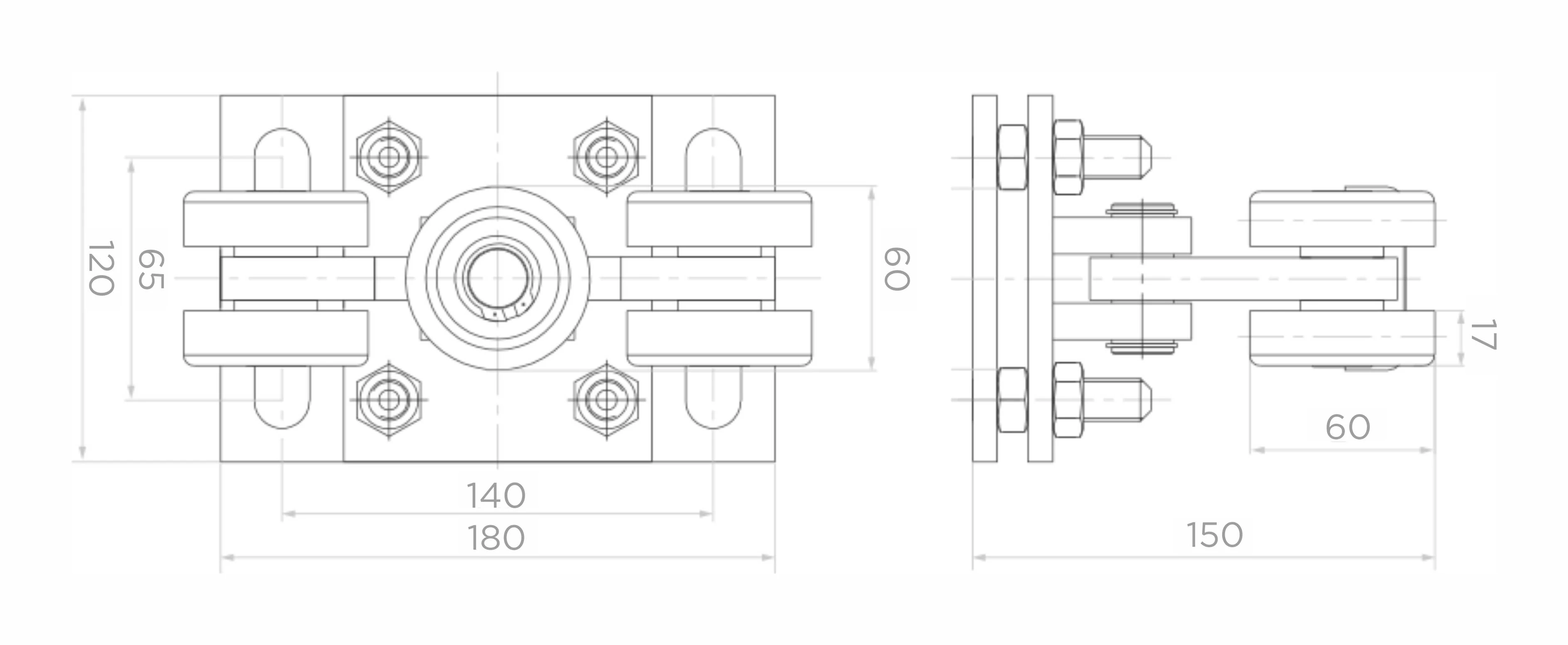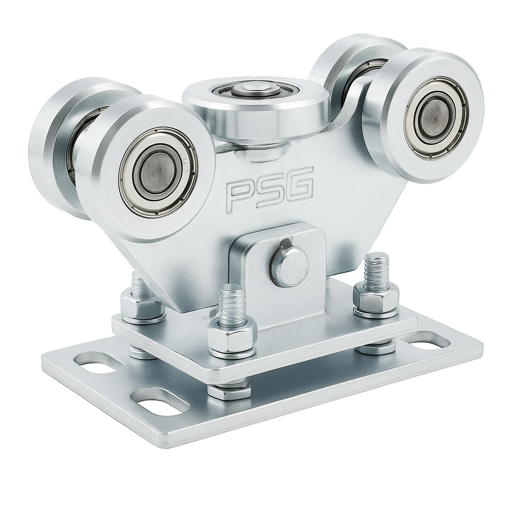 Der Laufwagen ist mit 5 Stahlrollen ausgestattet, darunter eine Horizontalrolle, die mit einer Führungsschiene der Abmessung 70×70×4 mm zusammenarbeiten. Alle Rollen sind auf Kugellagern gelagert, was einen geringen Rollwiderstand und einen leisen Betrieb gewährleistet. Der Schwenkmechanismus ermöglicht ein Kippen des Wagens gegenüber der Montageplatte – dadurch werden kleine Unebenheiten und Durchbiegungen der Schiene ausgeglichen und die Last gleichmäßig auf alle Rollen verteilt.