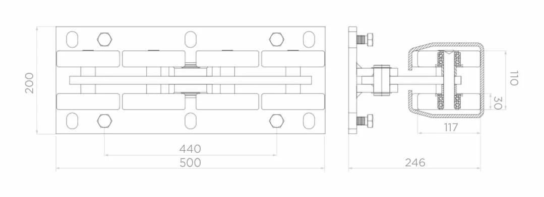 Der Laufwagen besteht aus einer massiven Montageplatte mit Bohrungen für eine schnelle und sichere Befestigung am Fundament. Auf der Platte sind 8 Laufrollen in zwei Reihen zu je vier angeordnet, was eine gleichmäßige Lastverteilung über die gesamte Länge der Führungsschiene gewährleistet. Die Rollenanordnung umgreift die Schiene von beiden Seiten — sowohl von oben als auch seitlich — sodass das Tor stabil geführt wird und selbst bei starkem Wind nicht aus der Bahn springt. Der Laufwagen ist kompatibel mit der Führungsschiene vom Typ 6V.140.