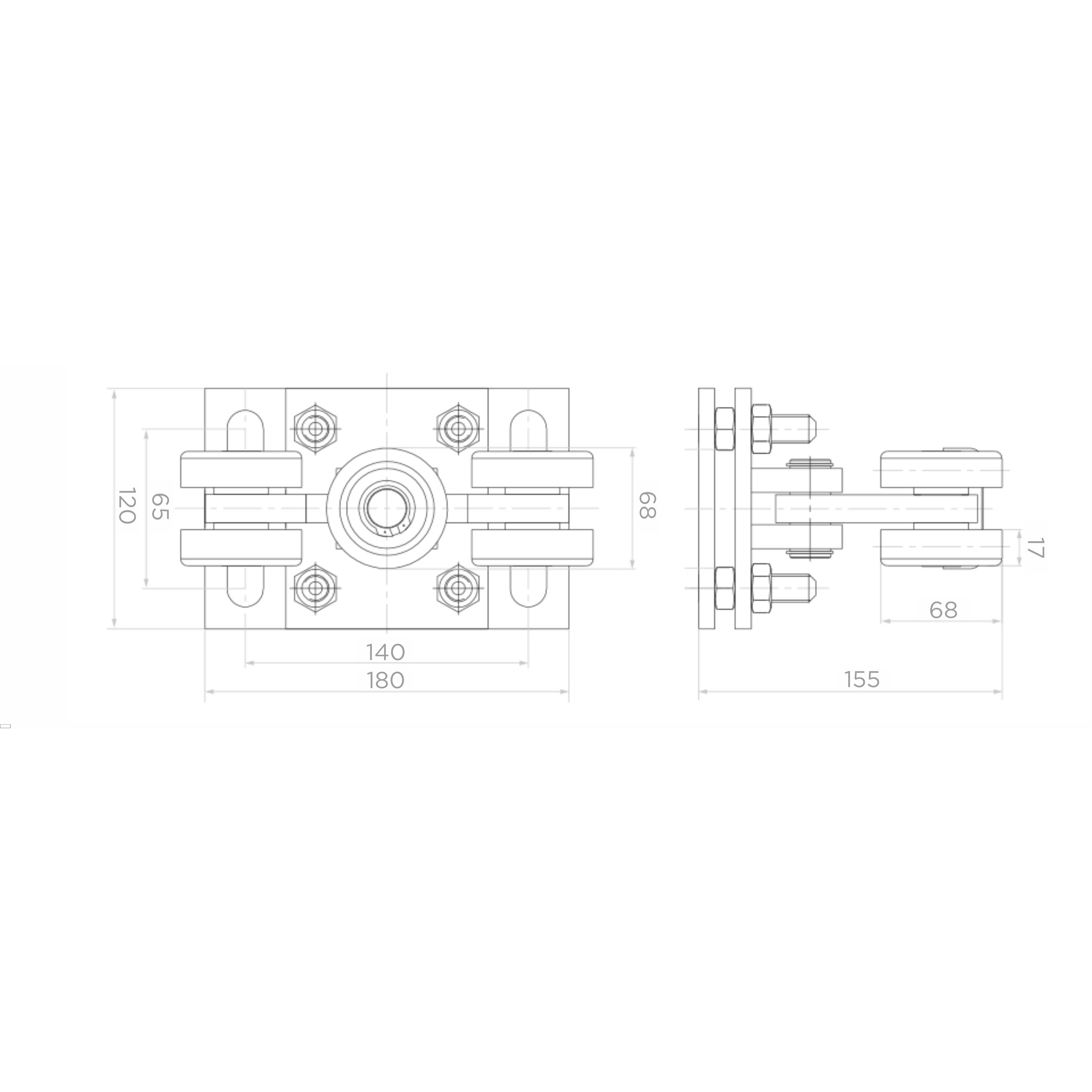 Die Montageplatte mit den Abmessungen 180×120 mm verfügt über Langlöcher (18×39 mm), die die Positionierung des Wagens bei der Befestigung am Fundament erleichtern. Der Rollenabstand beträgt 140 mm in der Längsachse und 68 mm in der Querachse; die Gesamttiefe des Wagens mit Rollen beträgt 155 mm.